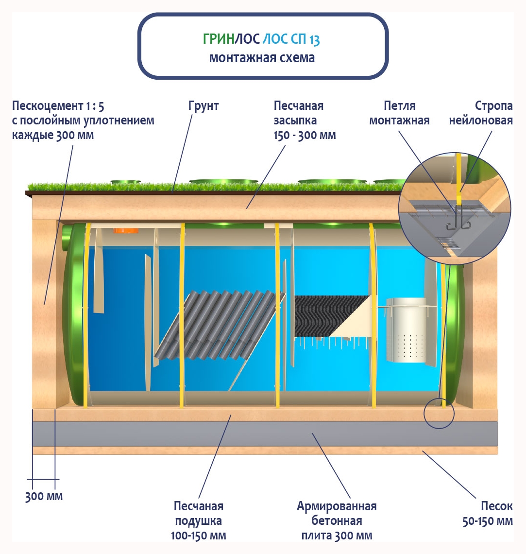 При заглублении ЛОС из стеклопластика на глубину не более 250 мм от верхнего пластикового горизонтального перекрытия до запланированного уровня земли, в однородных грунтах с низким уровнем вод обратную обсыпку допустимо производить песком, смешанным с цементом (марка не ниже М500). Соотношение цемента и песка для обсыпки составляет 1:5. Песчано-цементная засыпка производится послойно, с обязательным трамбованием и проливкой водой каждого слоя. Толщина каждого слоя 300 мм. При условии уровня грунтовых вод выше 1500 мм от уровня земли, при наличии плывуна, скальных грунтов и прочих нестандартных ситуациях, а также в случае заглубления ЛК 13-2300 Сп более чем на 250 мм песчано-цементную смесь необходимо заменить бетоном. Одновременно с засыпкой ливневой канализации, она заполняется водой. Уровень воды должен превышать уровень засыпки (бетонирования) не менее, чем на 200 мм и не более, чем на 500 мм.