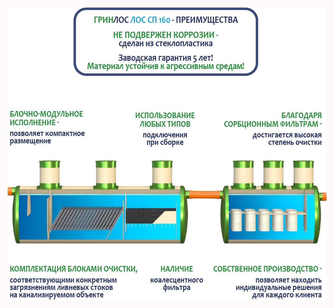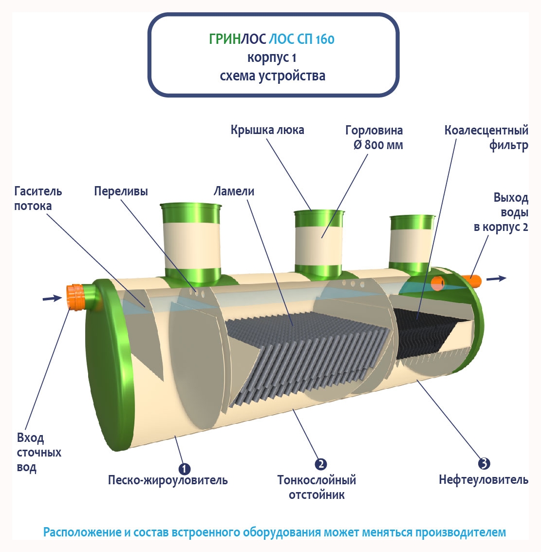 В базовую комплектацию Ливневой канализации Гринлос входит нефтеловушка, которая работает по принципу отстаивания стоков