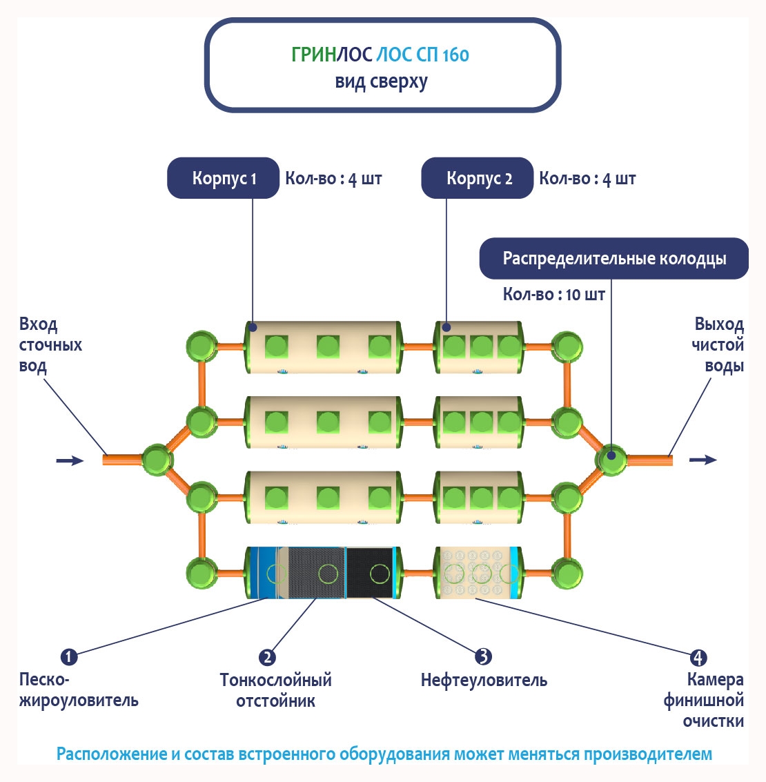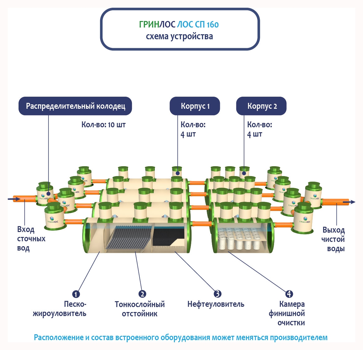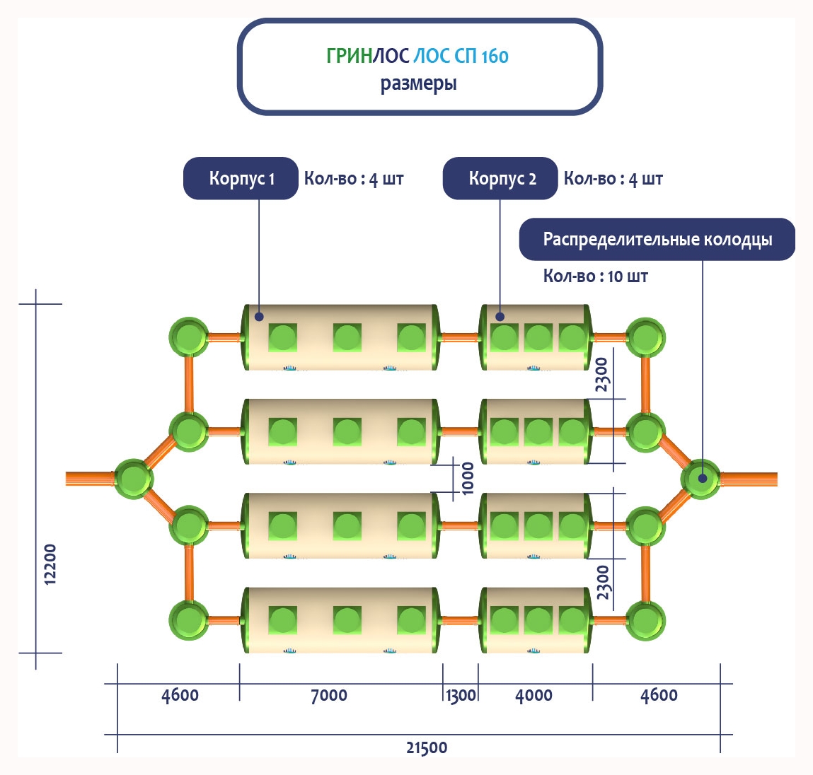 ГРИНЛОС Ливневая канализация 160-2300 стеклопластиковая представляет собой модульное очистное сооружение, состоящее из 8 корпусов размерами 7000*2300*2300 мм - 4 корпуса, 4000*2300*2300 мм - 4 корпуса. Объем отдельного корпуса 1 вида составляет 29.1 м3, 2 вида – 16.6 м3. Ввиду большого веса, для установки станции потребуется применение вспомогательного оборудования.