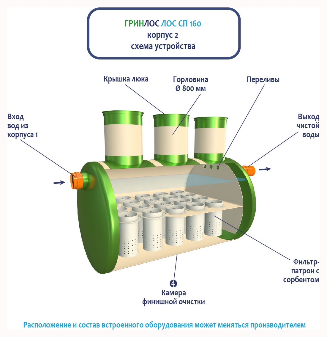 Далее стоки попадают в камеру финишной очистки ливневой канализации ГРИНЛОС Ливневая канализация 160-2300 стеклопластиковая и проходят через фильтр-патрон с сорбентом.
