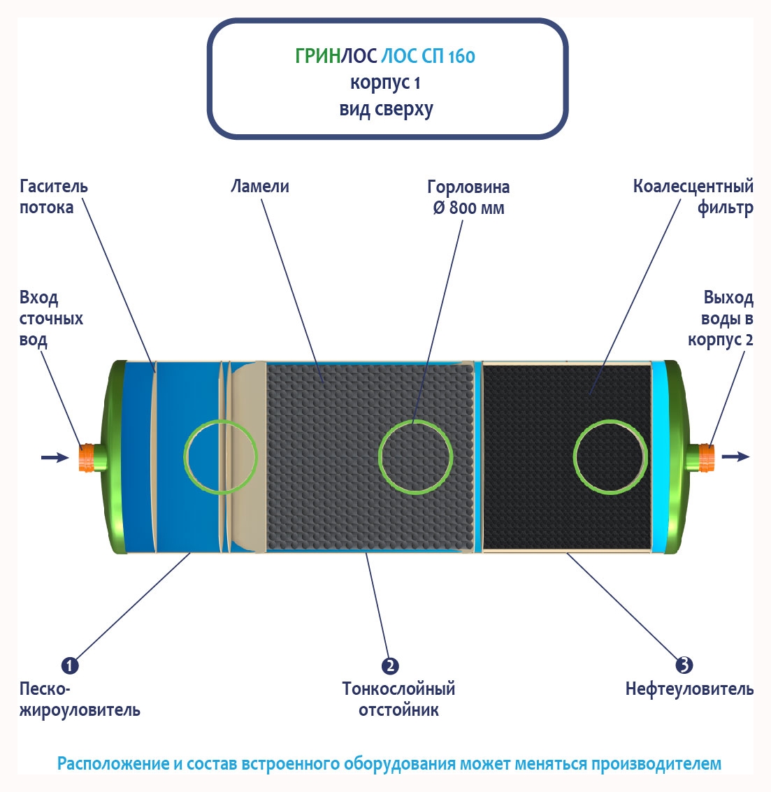 Стоки через входной патрубок корпуса Гринлос ГРИНЛОС Ливневая канализация 160-2300 стеклопластиковая попадают в песко-жироуловитель, где под воздействием седиментации из стоков выделяются взвеси и маслянистые вещества, за счет разницы плотностей твердые частицы оседают на дно, жиры собираются на поверхности.