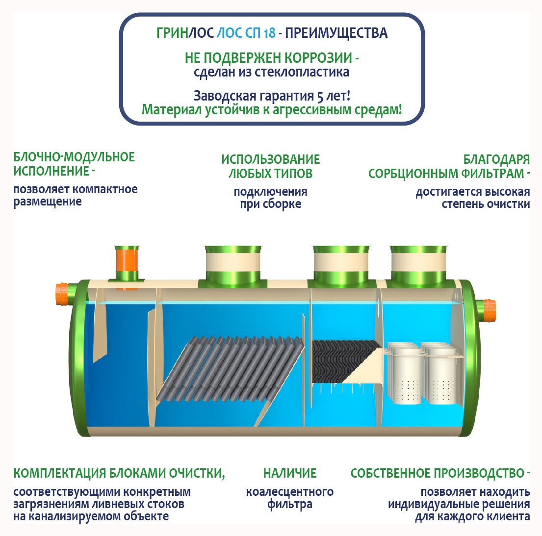 Гринлос ЛК 18-2300 Сп выполнена из стеклопластика – инертного материала, устойчивого к агрессивным средам.