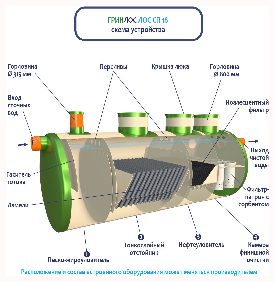 В базовую комплектацию Ливневой канализации Гринлос входит нефтеловушка, которая работает по принципу отстаивания стоков