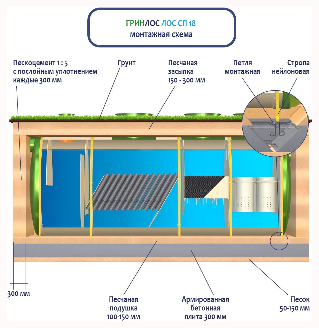 Перед началом работ выполняется входной контроль качества, осмотр оборудования с целью обнаружения дефектов, полученных при транспортировке и хранении, с последующим подписанием акта передачи оборудования в монтаж. Установка стеклопластиковой ливневой канализации ГРИНЛОС Ливневая канализация 18-2300 стеклопластиковая производится монтажным краном, с помощью четырехветвевой стропы. Изделие монтируется строго по уровню. После установки он фиксируется на плите синтетическими стропами за заранее подготовленные монтажные петли в плите.