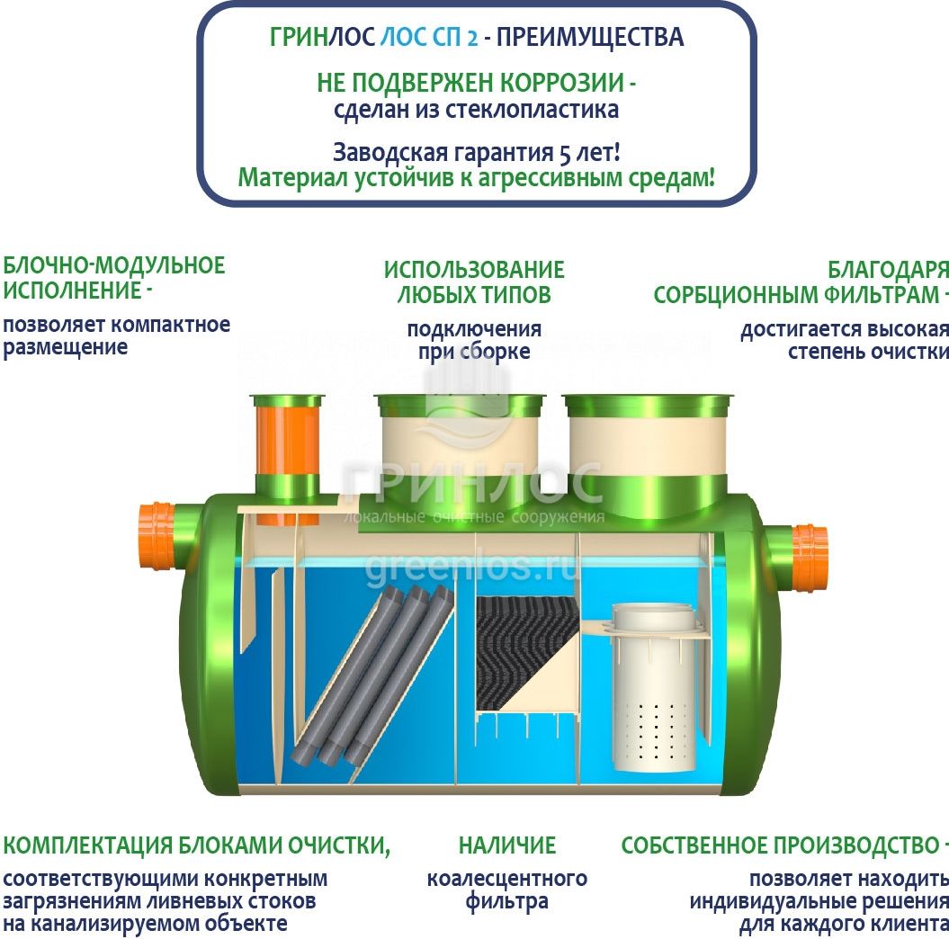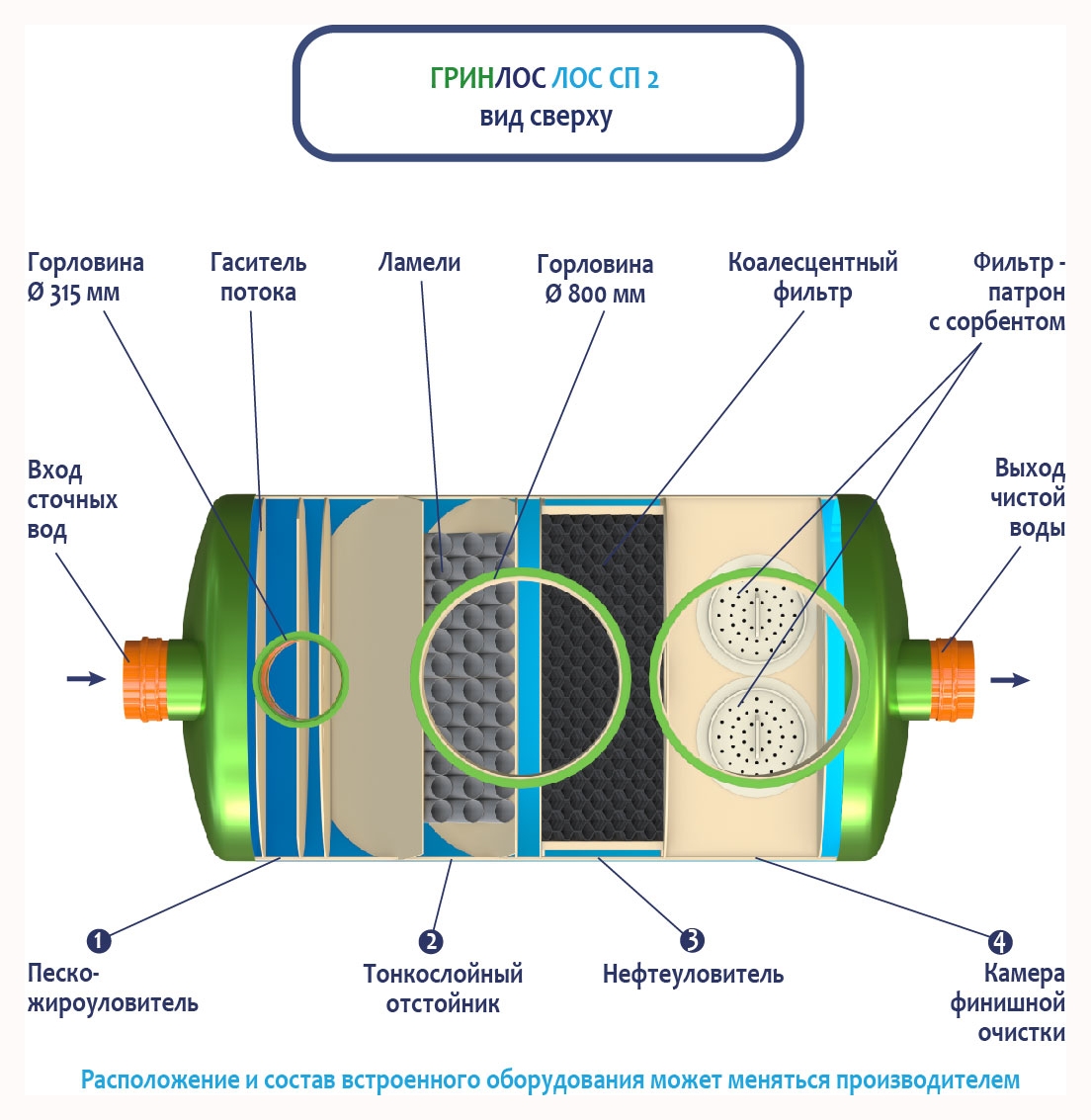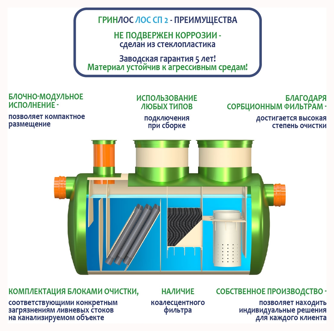 В базовую комплектацию Ливневой канализации Гринлос входит нефтеловушка, которая работает по принципу отстаивания стоков