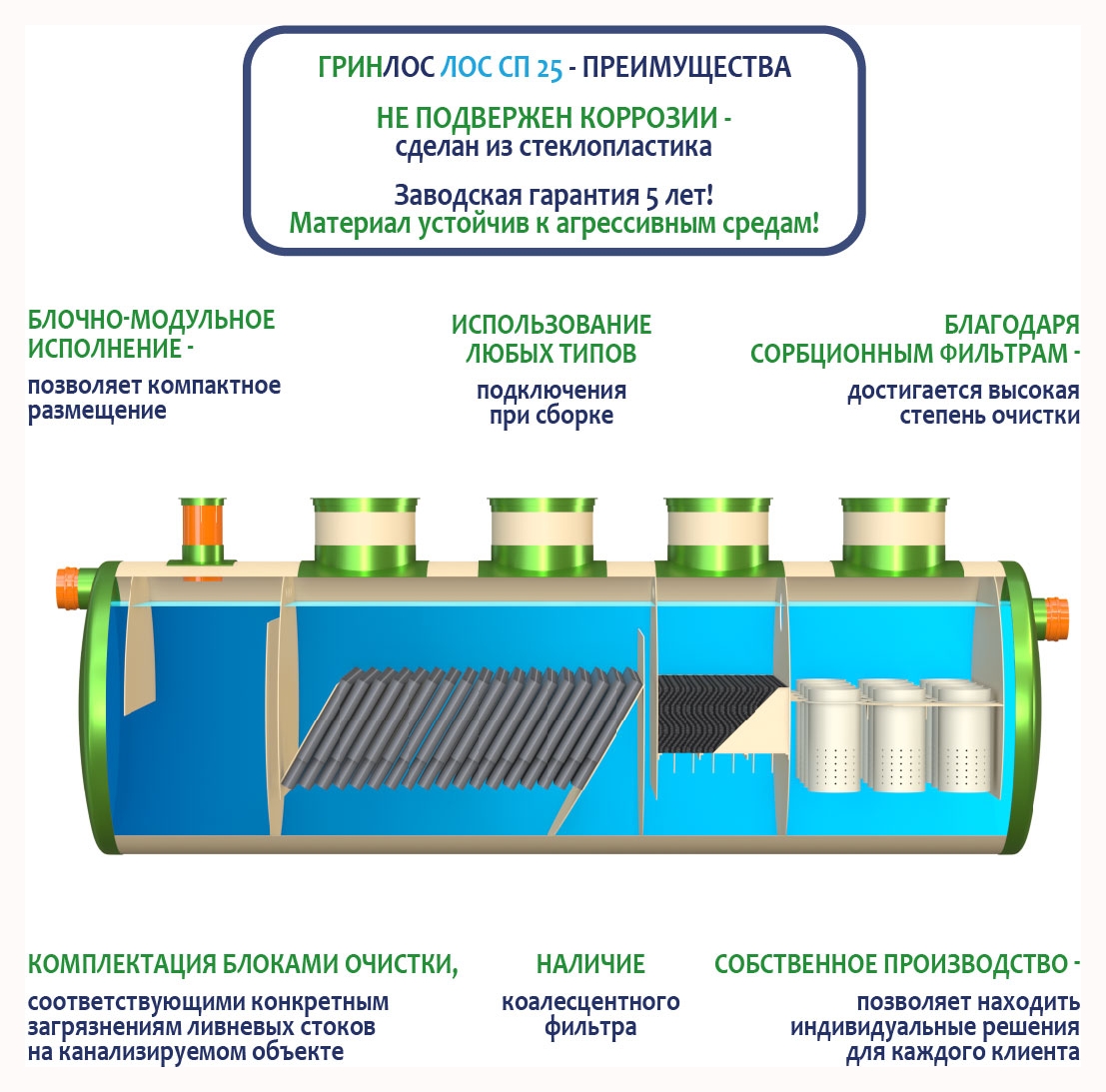 Гринлос ЛК 25-2300 Сп выполнена из стеклопластика – инертного материала, устойчивого к агрессивным средам.