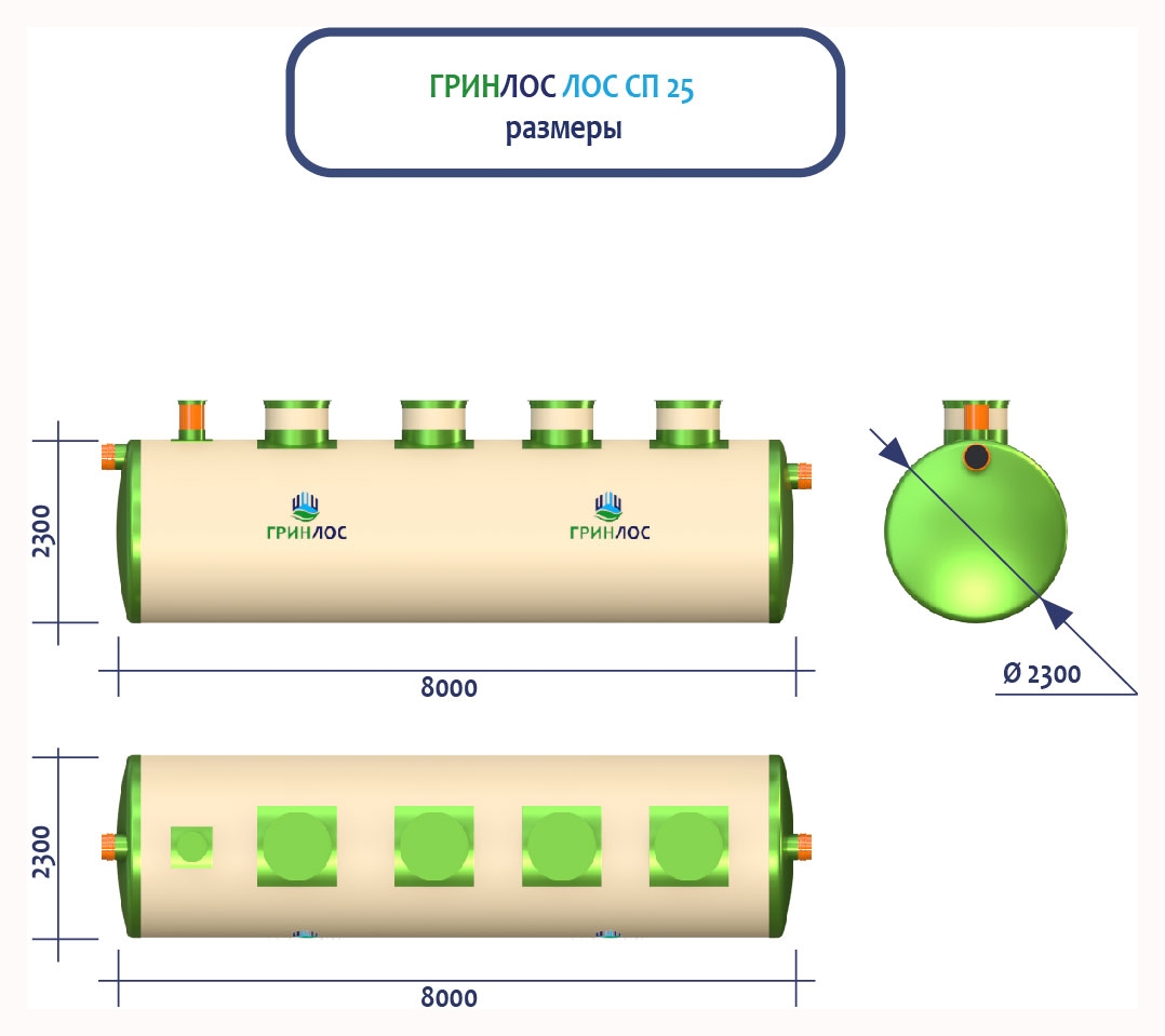 ГРИНЛОС Ливневая канализация 25-2300 стеклопластиковая представляет собой очистное сооружение ливневых стоков габаритами 8000*2300*2300 мм - 1 корпус. Общий объем корпусов составляет 33.2 м3. Для установки станции потребуется применение вспомогательного оборудования.