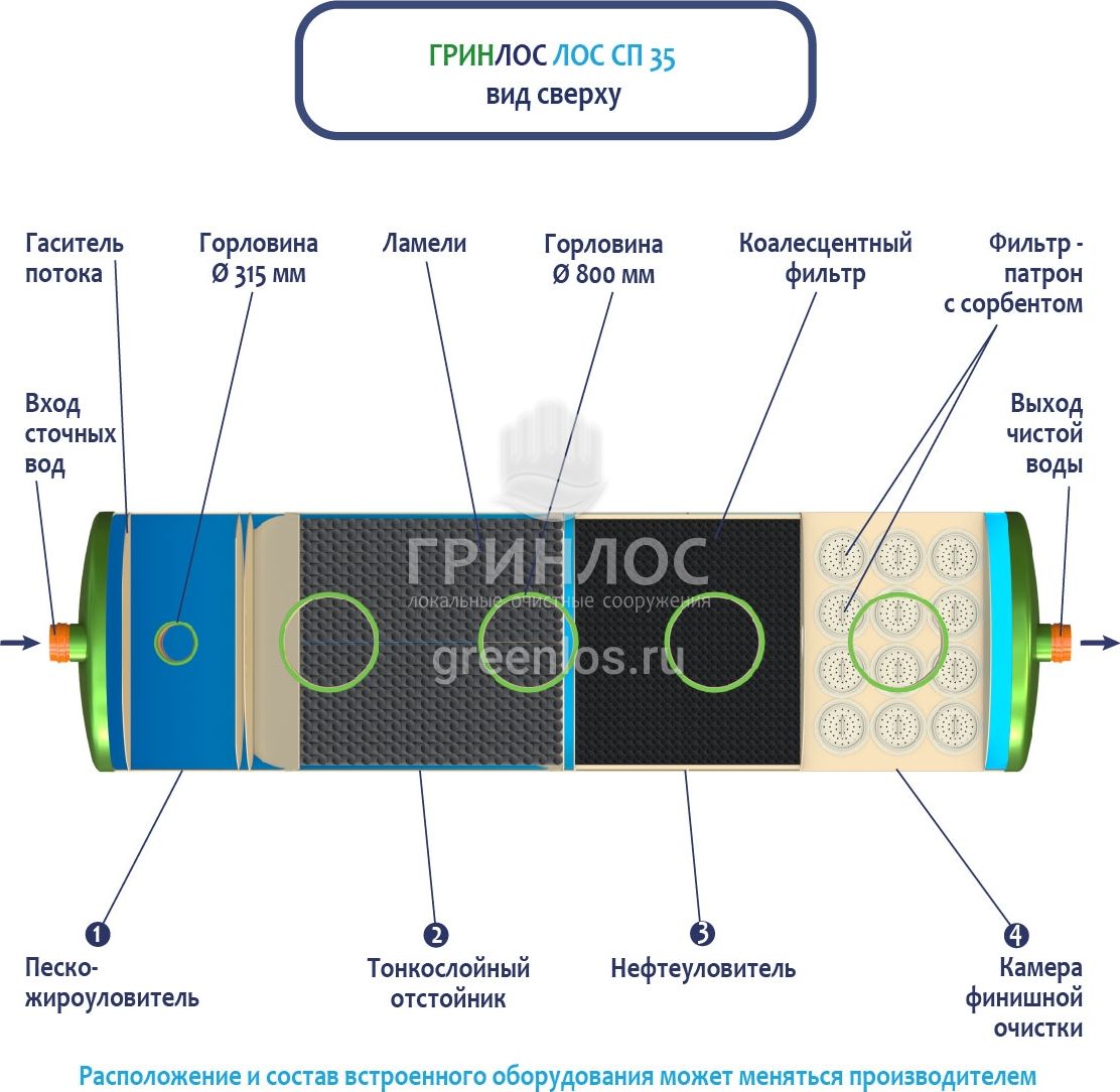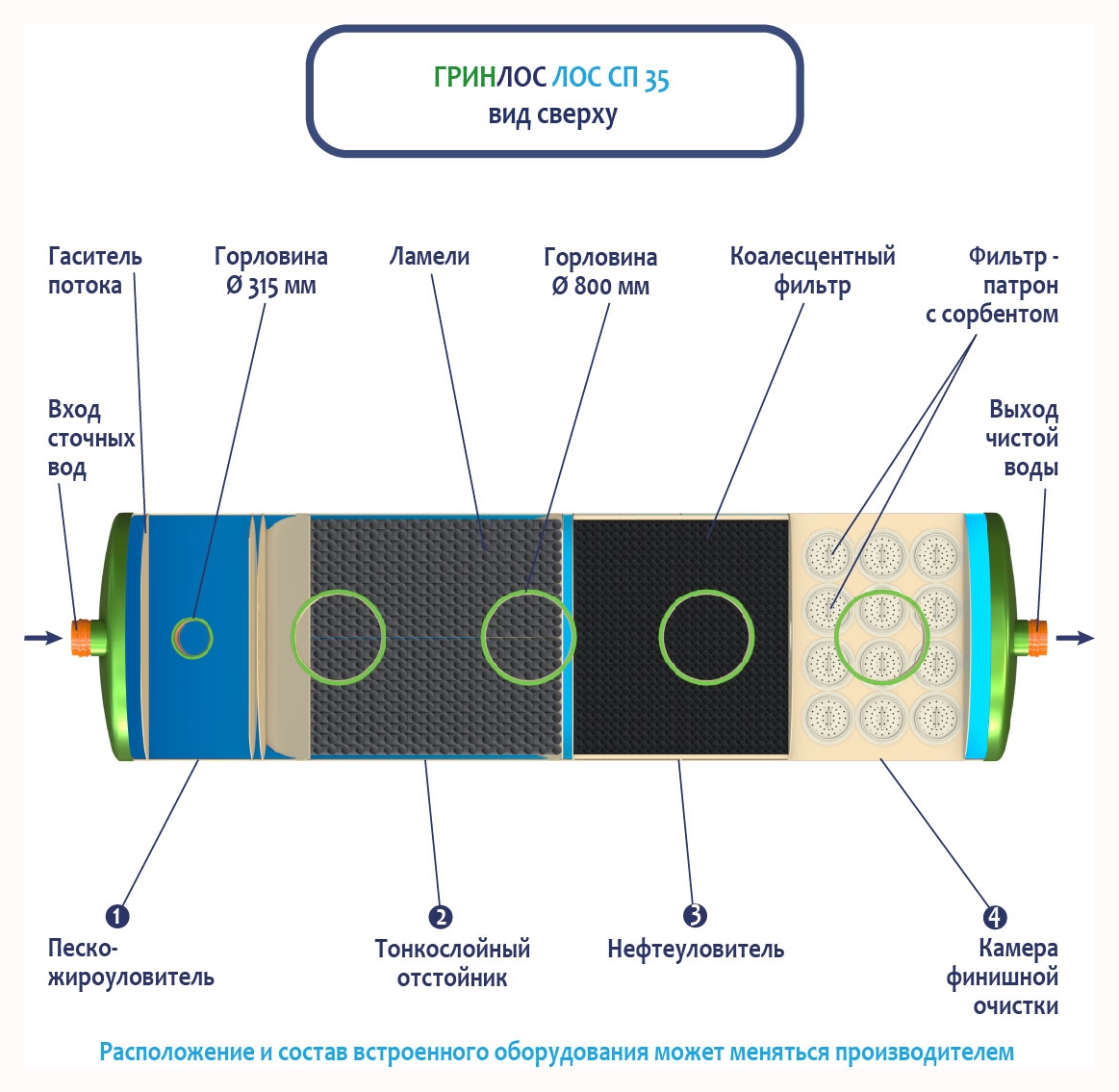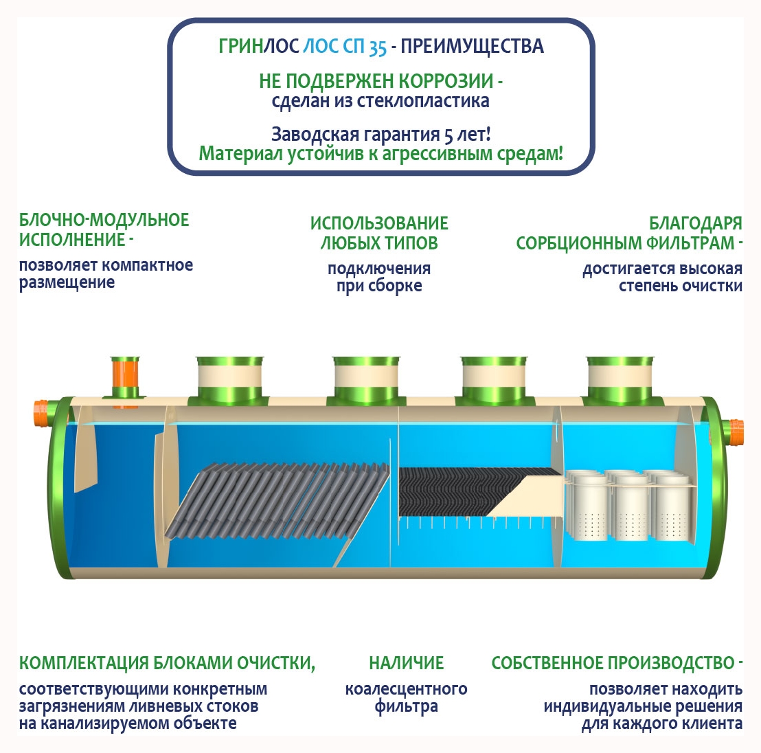 В базовую комплектацию Ливневой канализации Гринлос входит нефтеловушка, которая работает по принципу отстаивания стоков