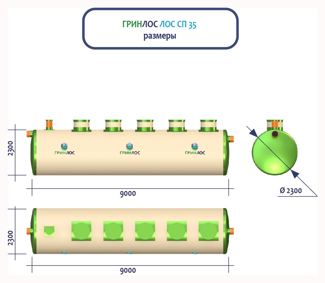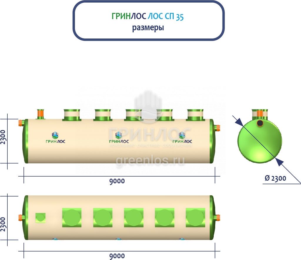 ГРИНЛОС Ливневая канализация 35-2300 стеклопластиковая представляет собой очистное сооружение ливневых стоков габаритами 9000*2300*2300 мм - 1 корпус. Общий объем корпусов составляет 37.4 м3. Для установки станции потребуется применение вспомогательного оборудования.
