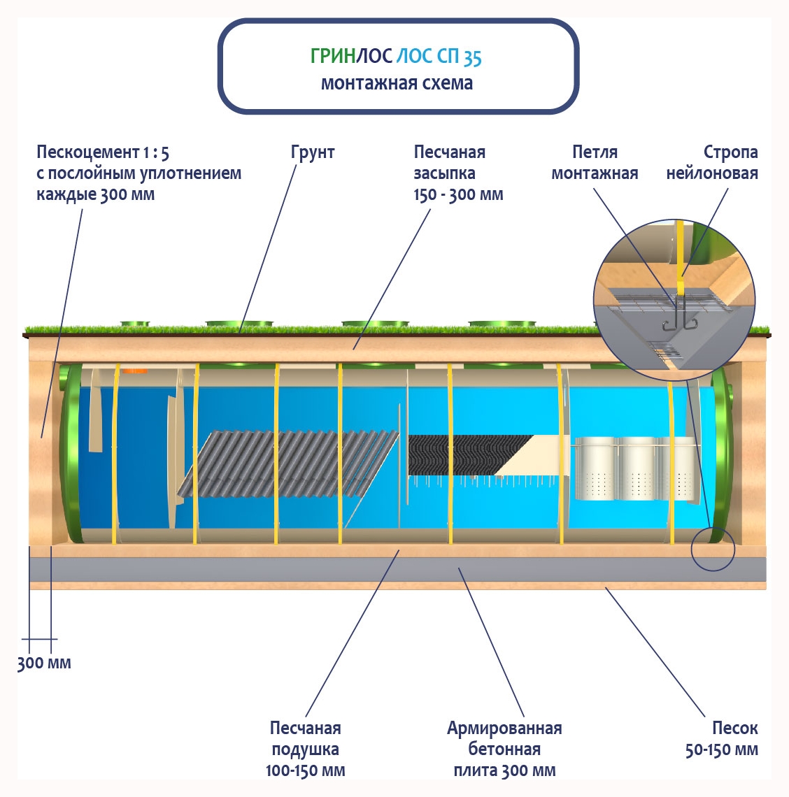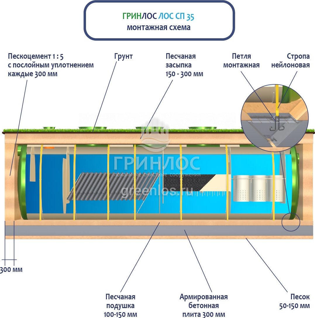 При заглублении ЛОС из стеклопластика на глубину не более 250 мм от верхнего пластикового горизонтального перекрытия до запланированного уровня земли, в однородных грунтах с низким уровнем вод обратную обсыпку допустимо производить песком, смешанным с цементом (марка не ниже М500). Соотношение цемента и песка для обсыпки составляет 1:5. Песчано-цементная засыпка производится послойно, с обязательным трамбованием и проливкой водой каждого слоя. Толщина каждого слоя 300 мм. При условии уровня грунтовых вод выше 1500 мм от уровня земли, при наличии плывуна, скальных грунтов и прочих нестандартных ситуациях, а также в случае заглубления ЛК 35-2300 Сп более чем на 250 мм песчано-цементную смесь необходимо заменить бетоном. Одновременно с засыпкой ливневой канализации, она заполняется водой. Уровень воды должен превышать уровень засыпки (бетонирования) не менее, чем на 200 мм и не более, чем на 500 мм.