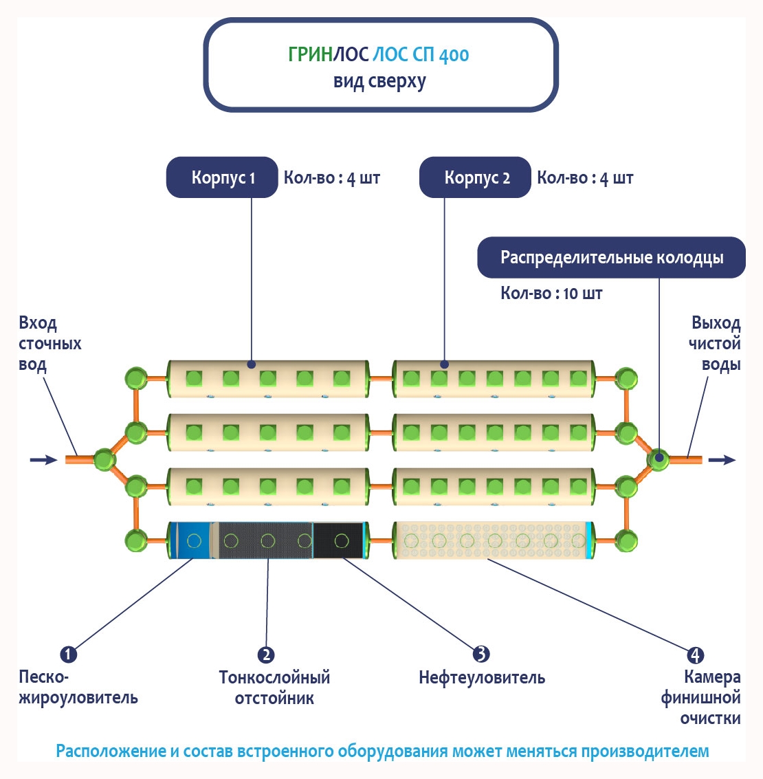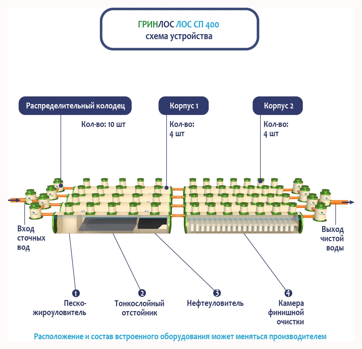 В Ливневой канализации ГРИНЛОС на 400м3 применяется классический принцип очистки дождевых и талых вод, заключающийся в поэтапном прохождении стоков через четыре отсека: