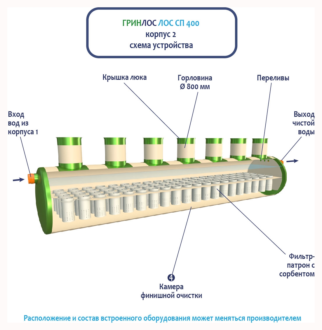 Гринлос ЛК 400-2300 Сп выполнена из стеклопластика – инертного материала, устойчивого к агрессивным средам.