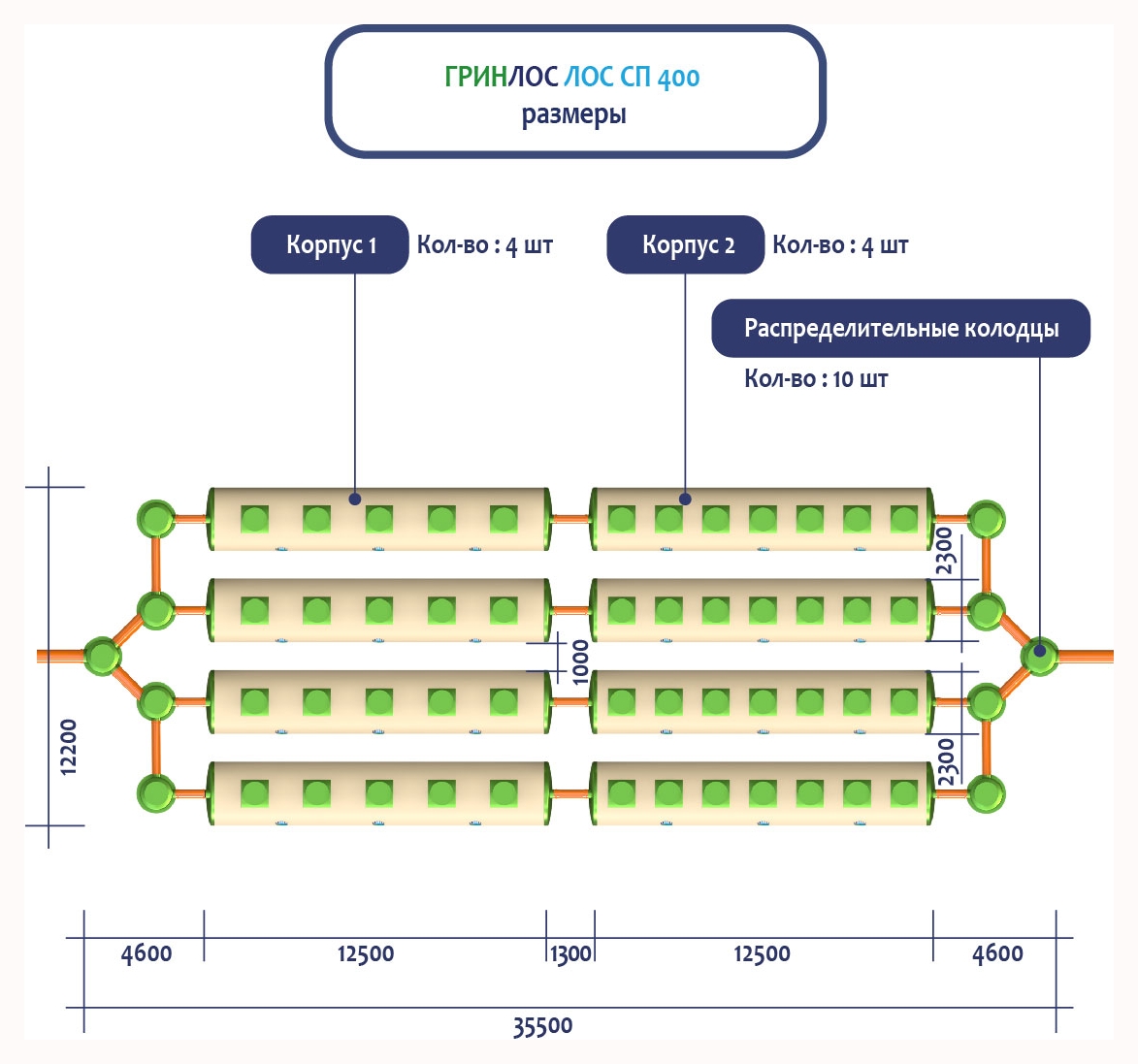ГРИНЛОС Ливневая канализация 400-2300 стеклопластиковая представляет собой модульное очистное сооружение, состоящее из 8 корпусов размерами 12500*2300*2300 мм - 4 корпуса, 12500*2300*2300 мм - 4 корпуса. Объем отдельного корпуса 1 вида составляет 51.9 м3, 2 вида – 51.9 м3. Ввиду большого веса, для установки станции потребуется применение вспомогательного оборудования.