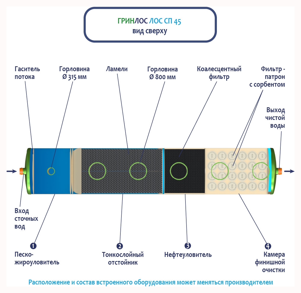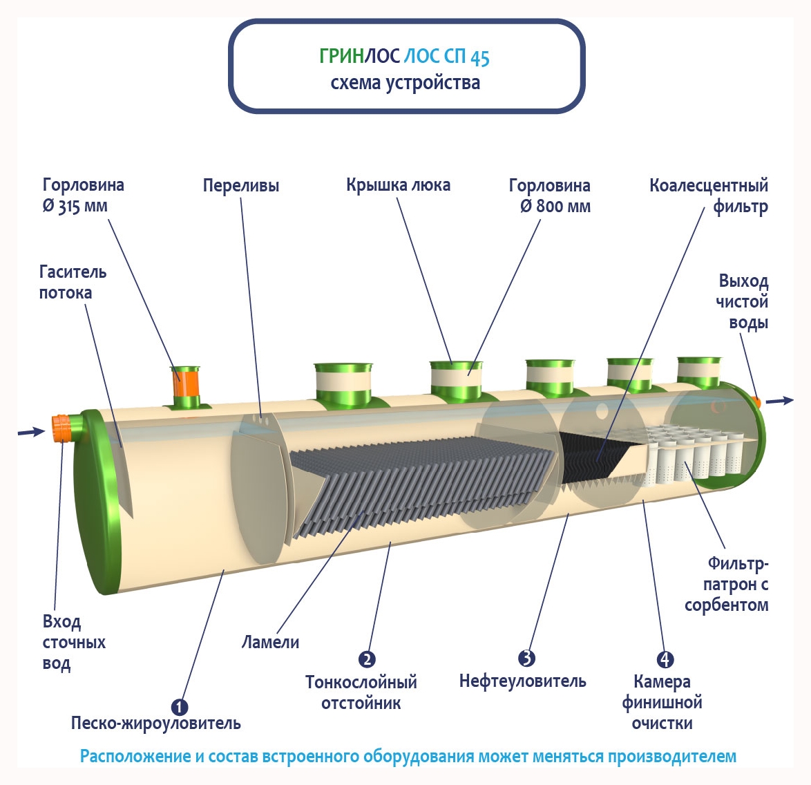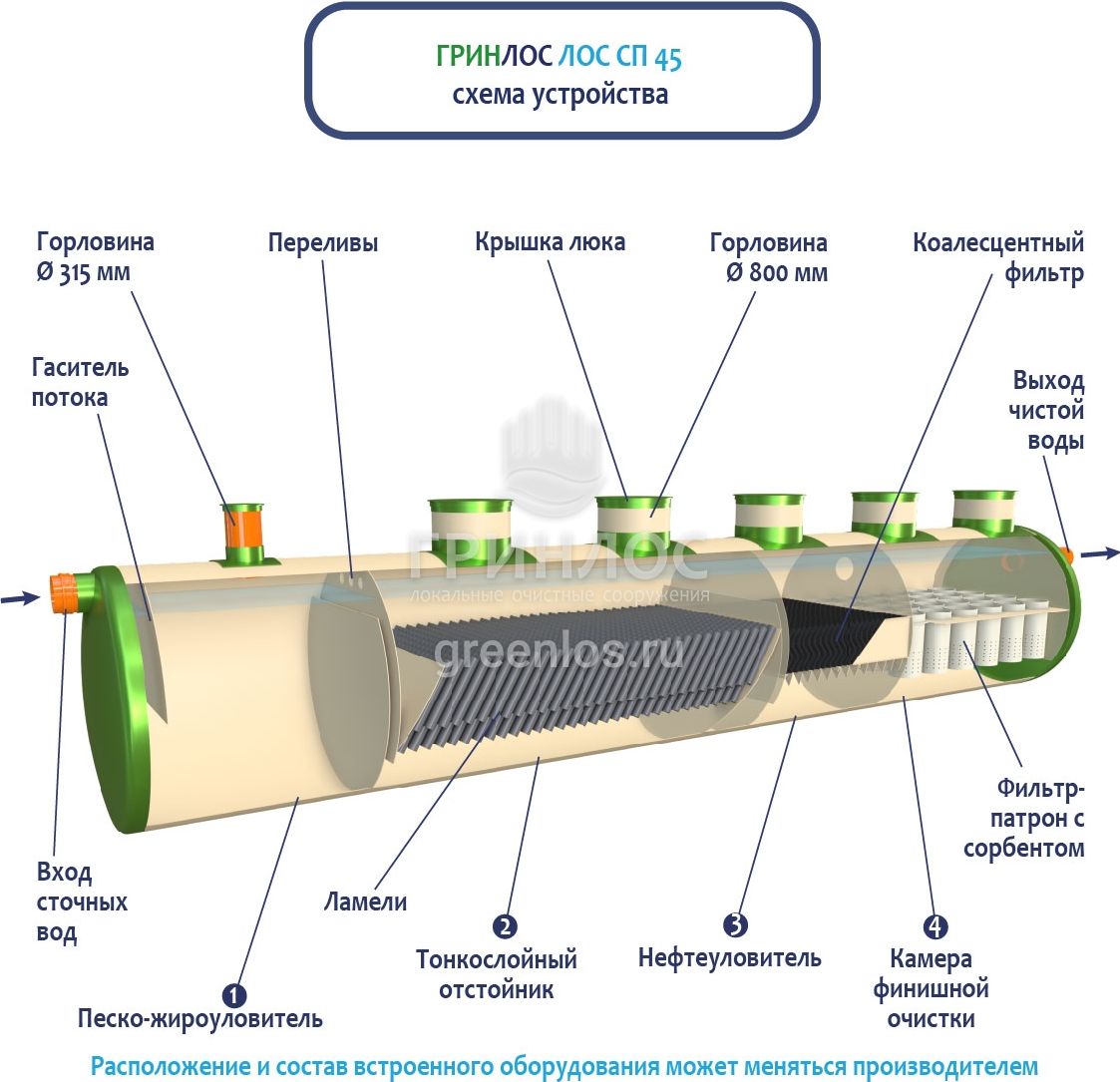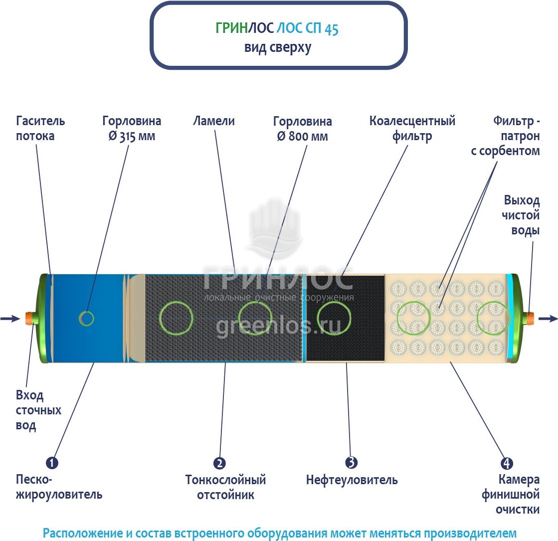 В базовую комплектацию Ливневой канализации Гринлос входит нефтеловушка, которая работает по принципу отстаивания стоков