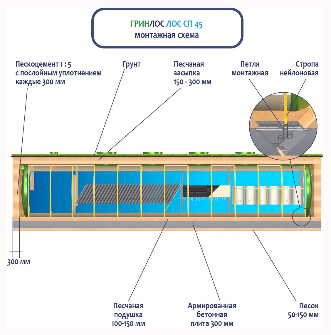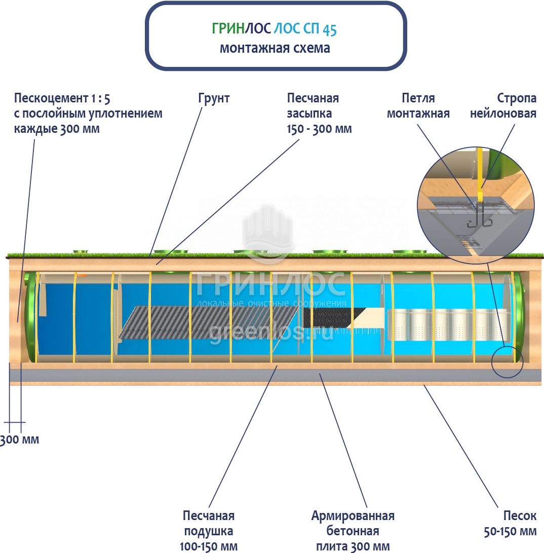 При заглублении ЛОС из стеклопластика на глубину не более 250 мм от верхнего пластикового горизонтального перекрытия до запланированного уровня земли, в однородных грунтах с низким уровнем вод обратную обсыпку допустимо производить песком, смешанным с цементом (марка не ниже М500). Соотношение цемента и песка для обсыпки составляет 1:5. Песчано-цементная засыпка производится послойно, с обязательным трамбованием и проливкой водой каждого слоя. Толщина каждого слоя 300 мм. При условии уровня грунтовых вод выше 1500 мм от уровня земли, при наличии плывуна, скальных грунтов и прочих нестандартных ситуациях, а также в случае заглубления ЛК 45-2300 Сп более чем на 250 мм песчано-цементную смесь необходимо заменить бетоном. Одновременно с засыпкой ливневой канализации, она заполняется водой. Уровень воды должен превышать уровень засыпки (бетонирования) не менее, чем на 200 мм и не более, чем на 500 мм.