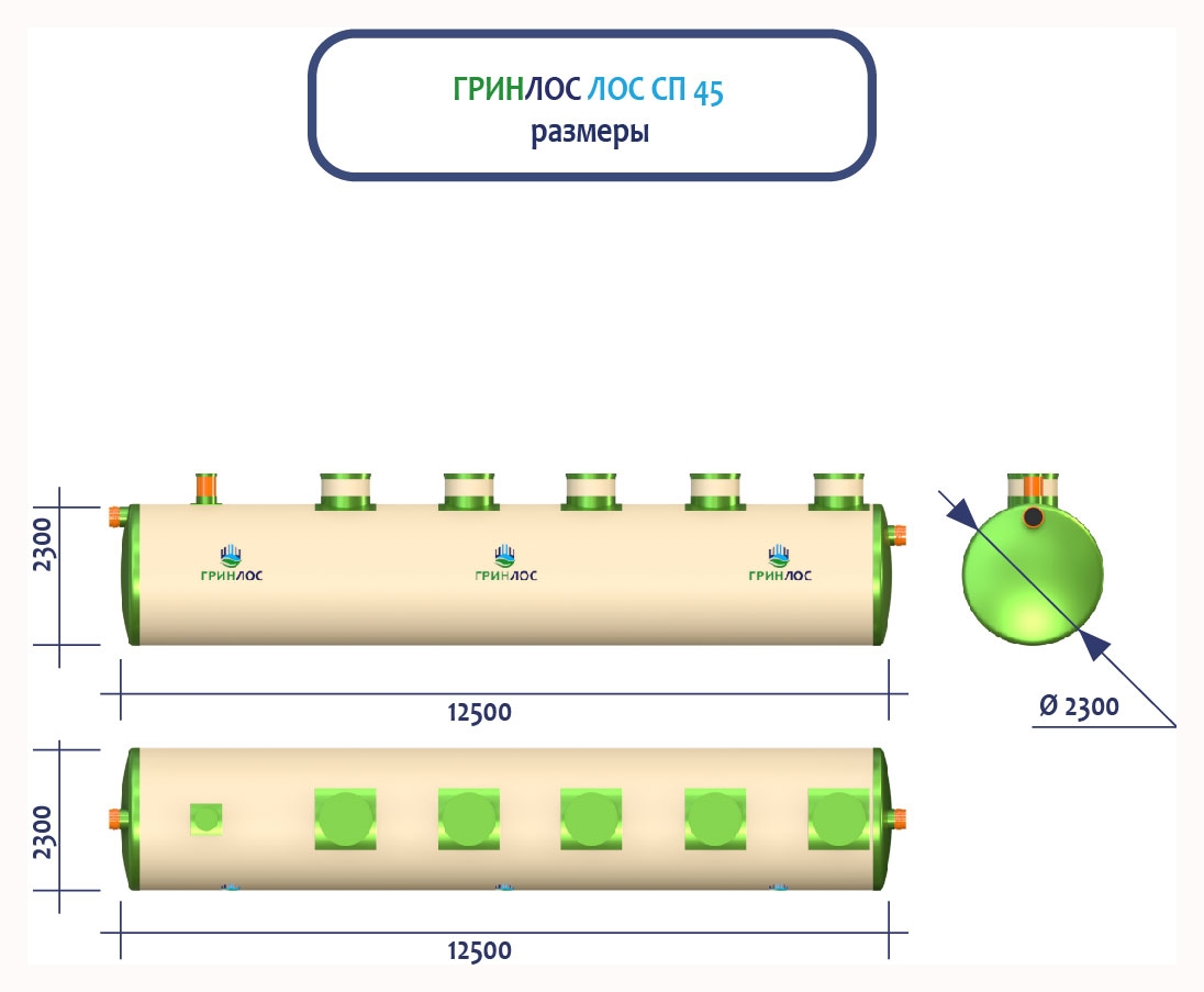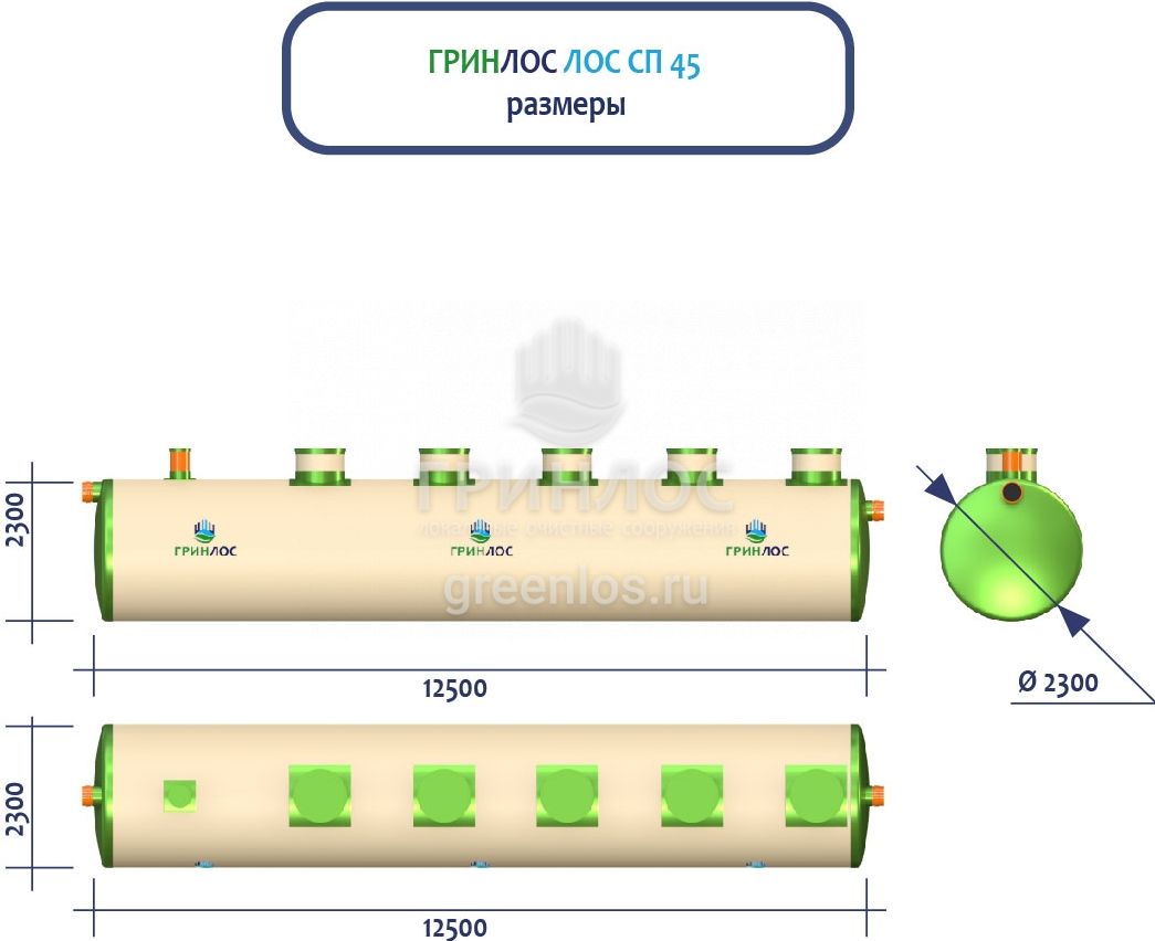 ГРИНЛОС Ливневая канализация 45-2300 стеклопластиковая представляет собой очистное сооружение ливневых стоков габаритами 12500*2300*2300 мм - 1 корпус. Общий объем корпусов составляет 51.9 м3. Для установки станции потребуется применение вспомогательного оборудования.