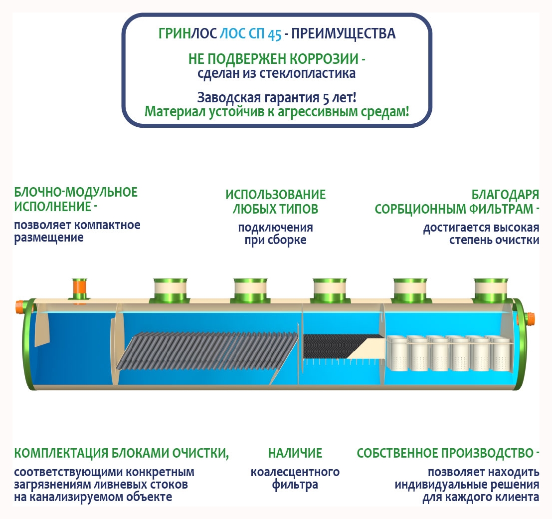 Гринлос ЛК 45-2300 Сп выполнена из стеклопластика – инертного материала, устойчивого к агрессивным средам.