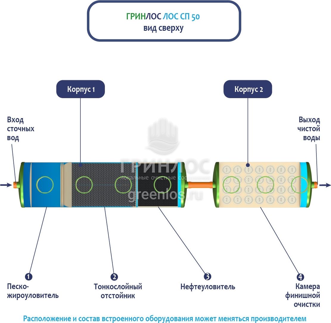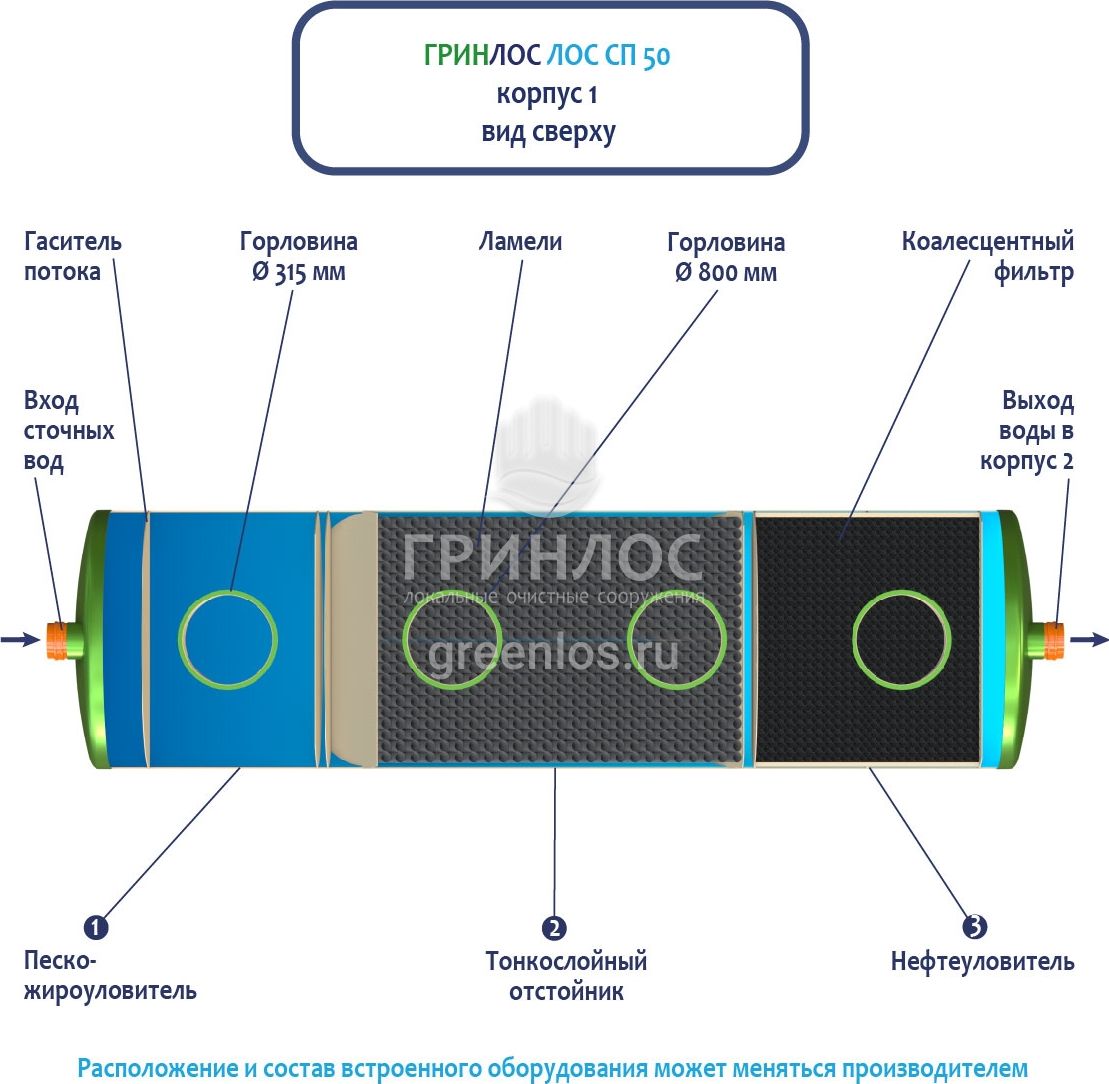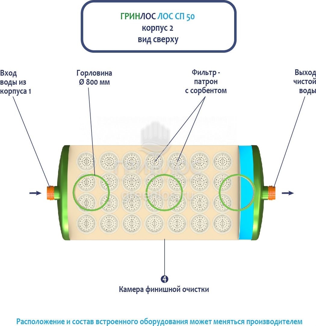 Гринлос ГРИНЛОС Ливневая канализация 50-2300 стеклопластиковая - Внутреннее устройство корпусов 1 и 2, вид сверху