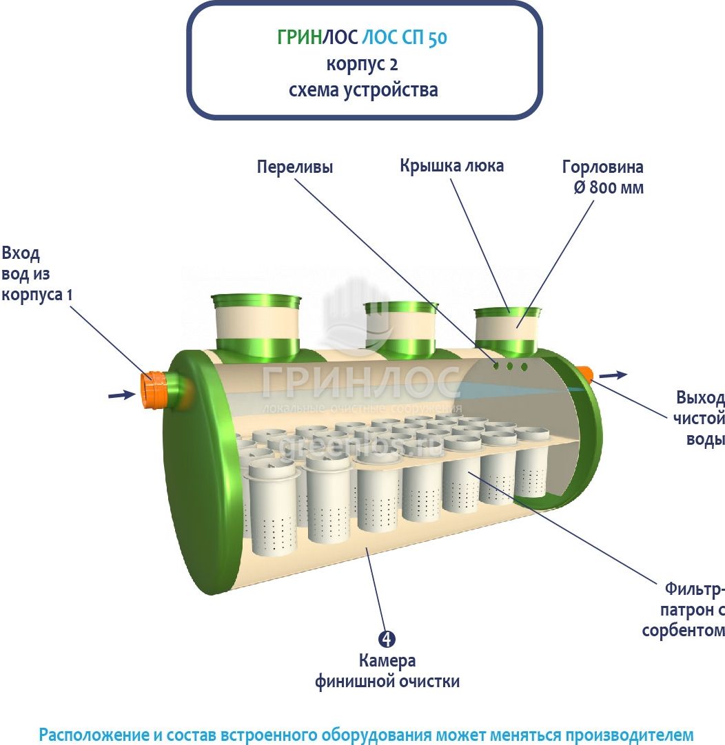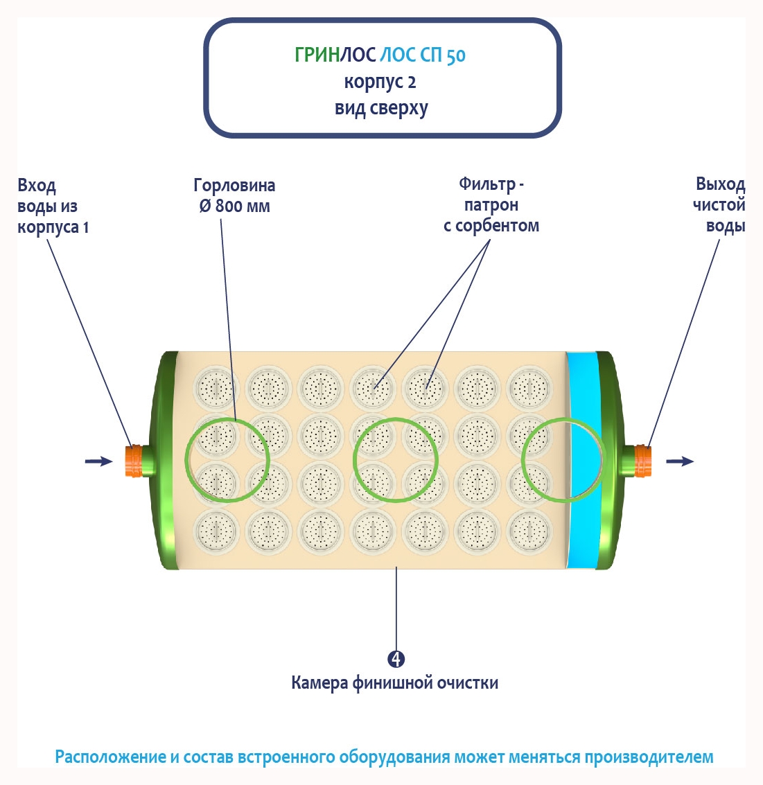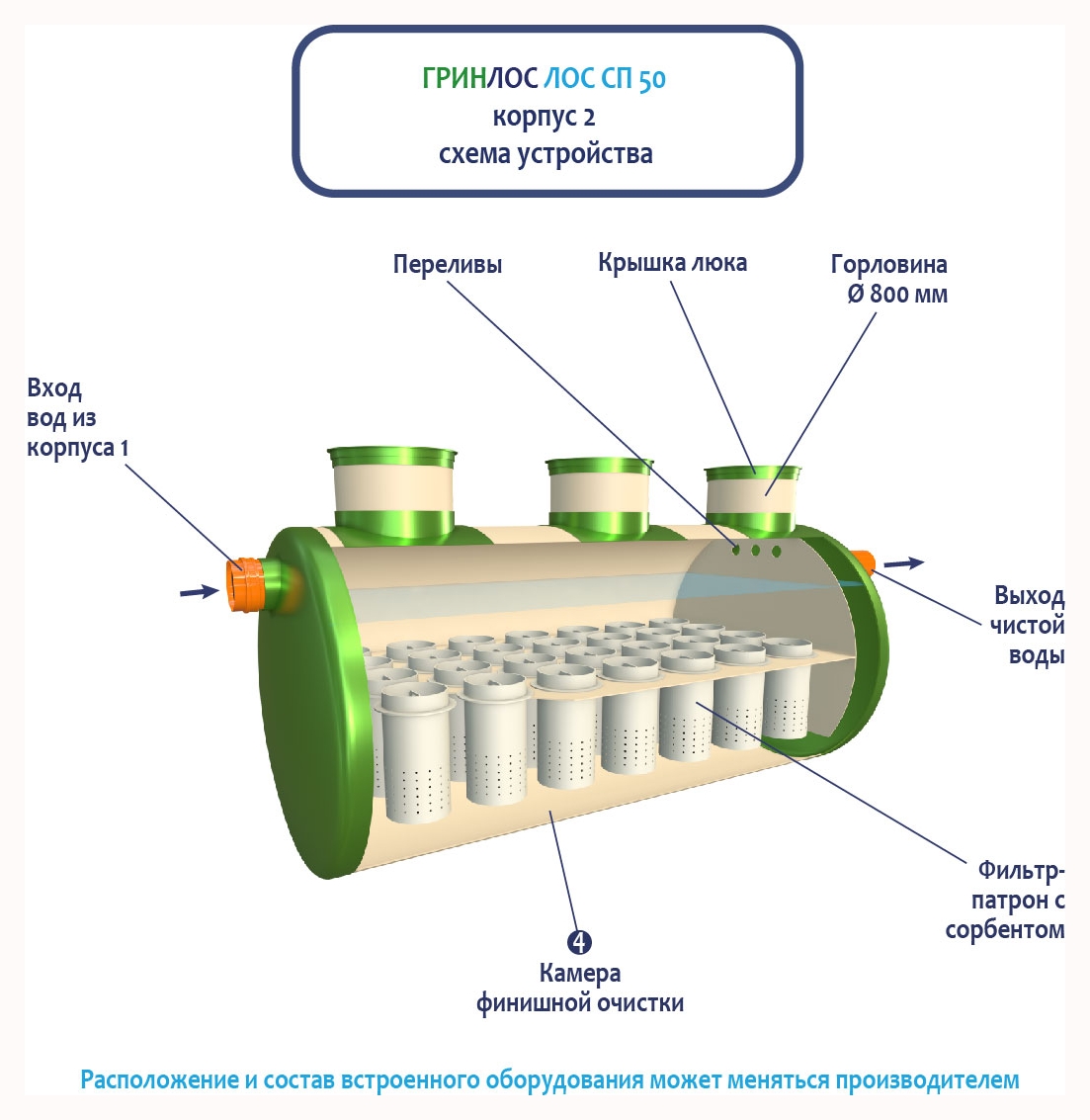 Далее стоки попадают в камеру финишной очистки ливневой канализации ГРИНЛОС Ливневая канализация 50-2300 стеклопластиковая и проходят через фильтр-патрон с сорбентом.