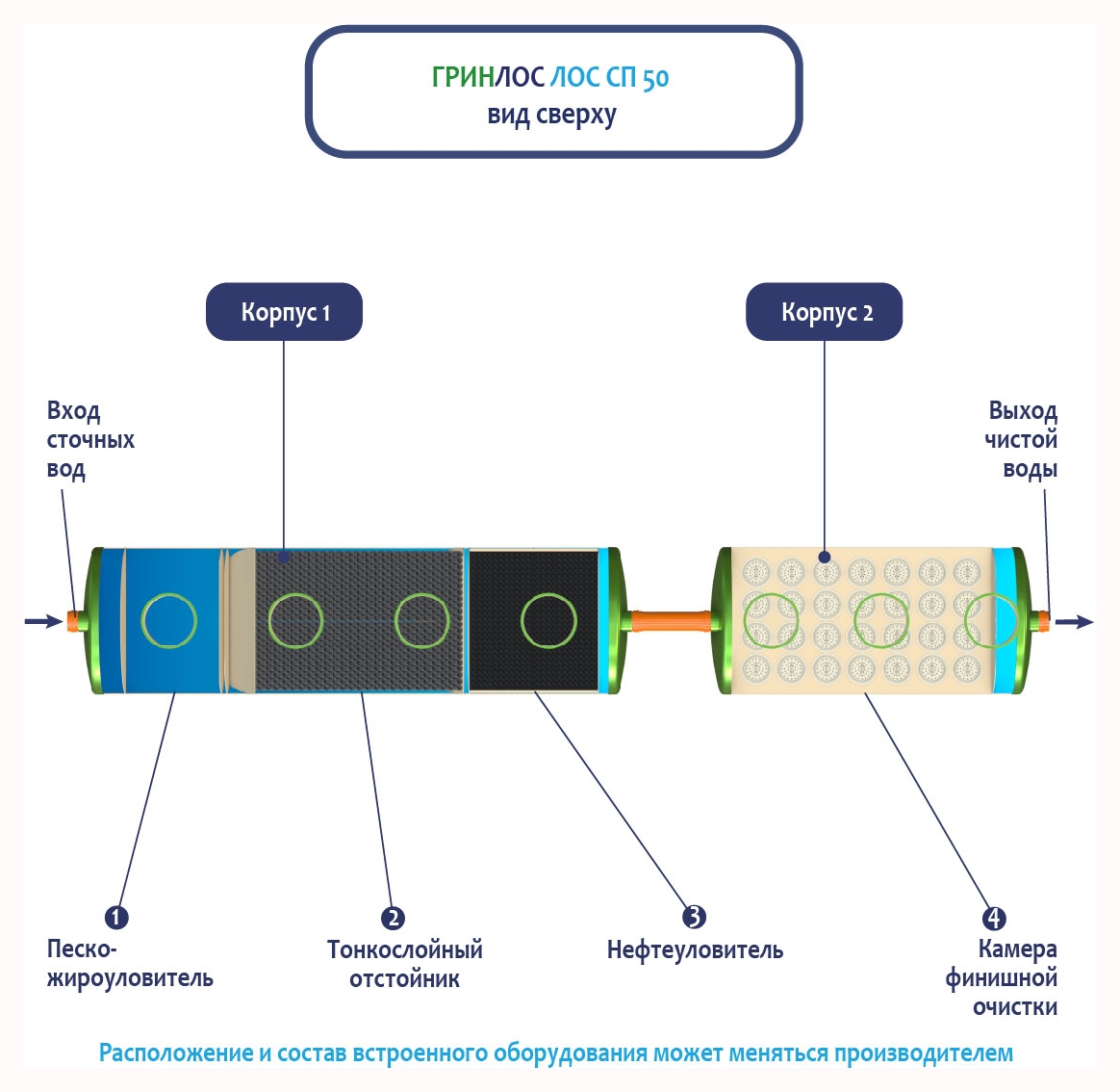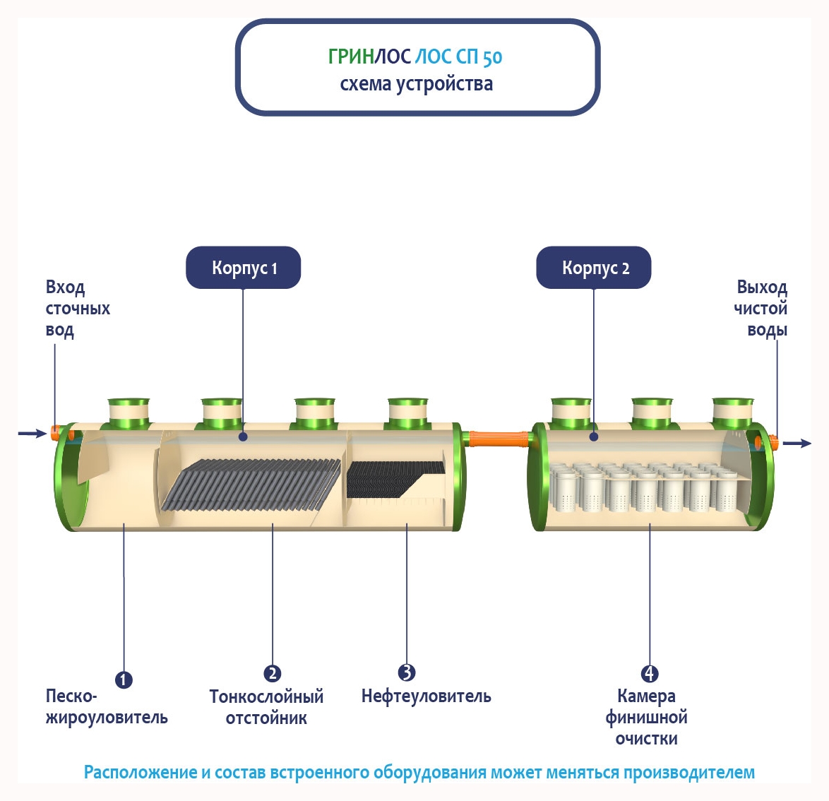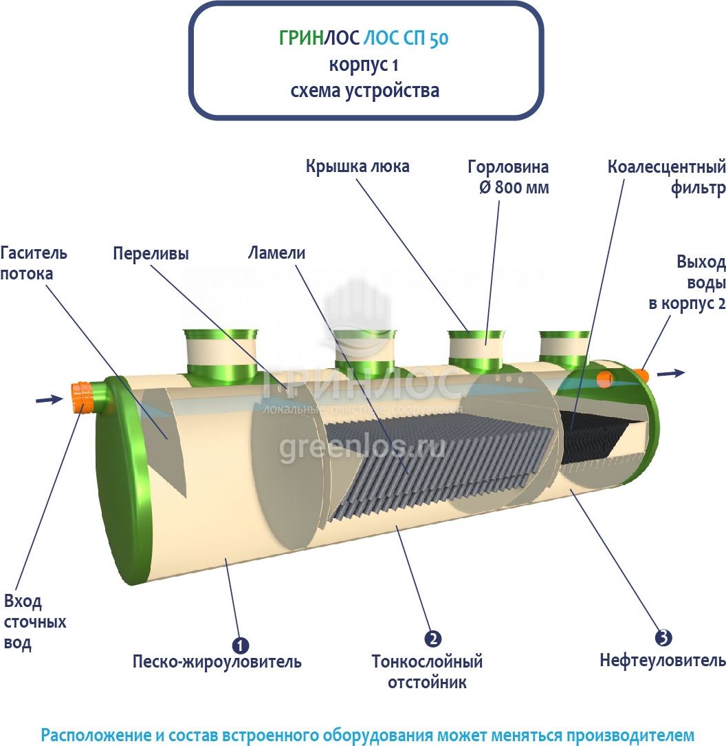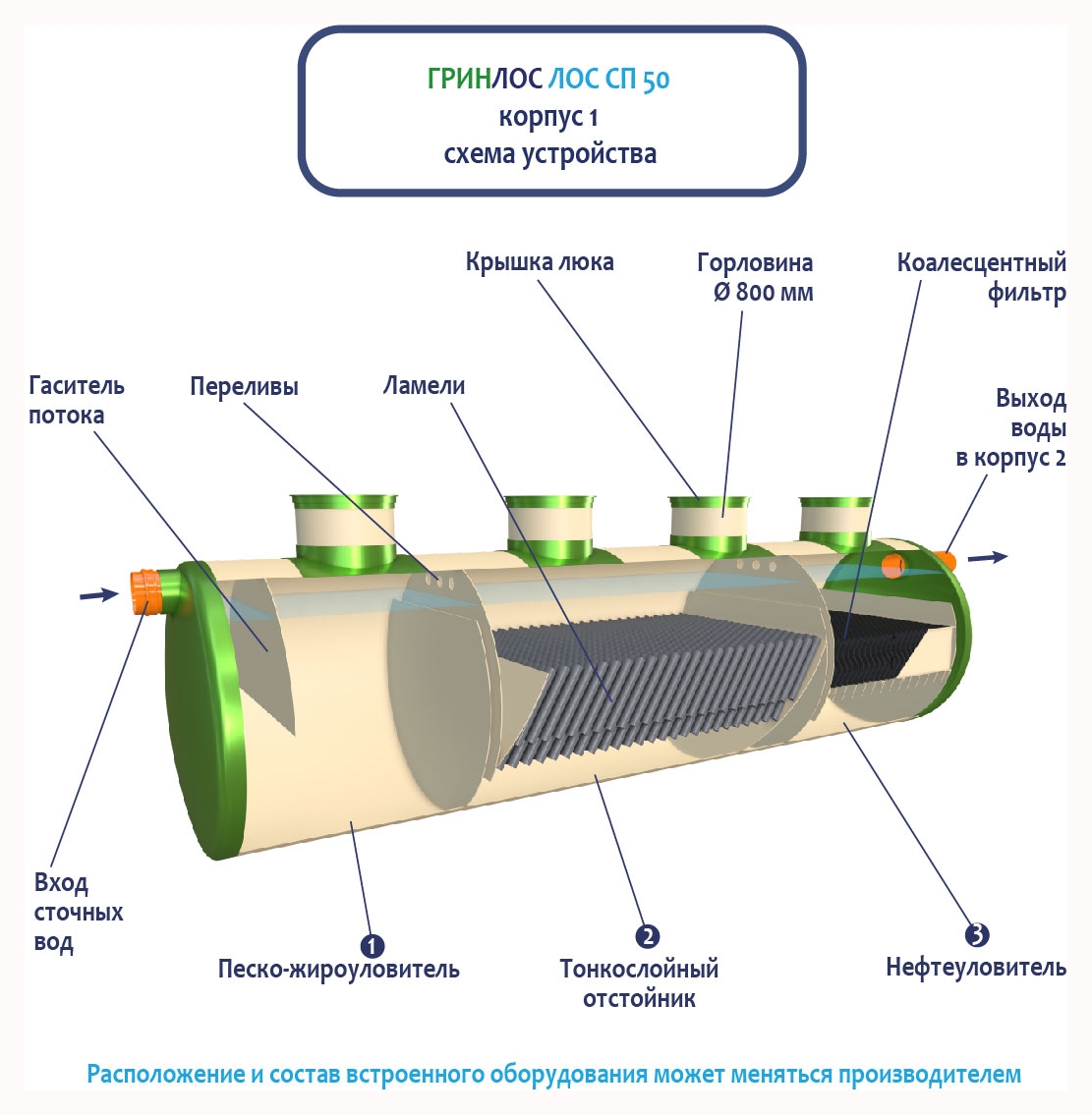 В базовую комплектацию Ливневой канализации Гринлос входит нефтеловушка, которая работает по принципу отстаивания стоков