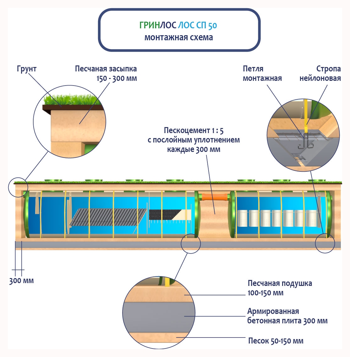 При заглублении ЛОС из стеклопластика на глубину не более 250 мм от верхнего пластикового горизонтального перекрытия до запланированного уровня земли, в однородных грунтах с низким уровнем вод обратную обсыпку допустимо производить песком, смешанным с цементом (марка не ниже М500). Соотношение цемента и песка для обсыпки составляет 1:5. Песчано-цементная засыпка производится послойно, с обязательным трамбованием и проливкой водой каждого слоя. Толщина каждого слоя 300 мм. При условии уровня грунтовых вод выше 1500 мм от уровня земли, при наличии плывуна, скальных грунтов и прочих нестандартных ситуациях, а также в случае заглубления ЛК 50-2300 Сп более чем на 250 мм песчано-цементную смесь необходимо заменить бетоном. Одновременно с засыпкой ливневой канализации, она заполняется водой. Уровень воды должен превышать уровень засыпки (бетонирования) не менее, чем на 200 мм и не более, чем на 500 мм.