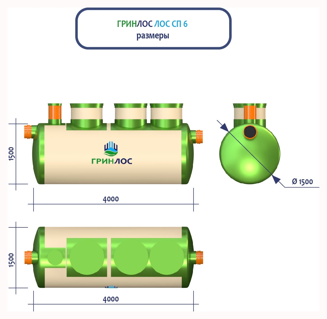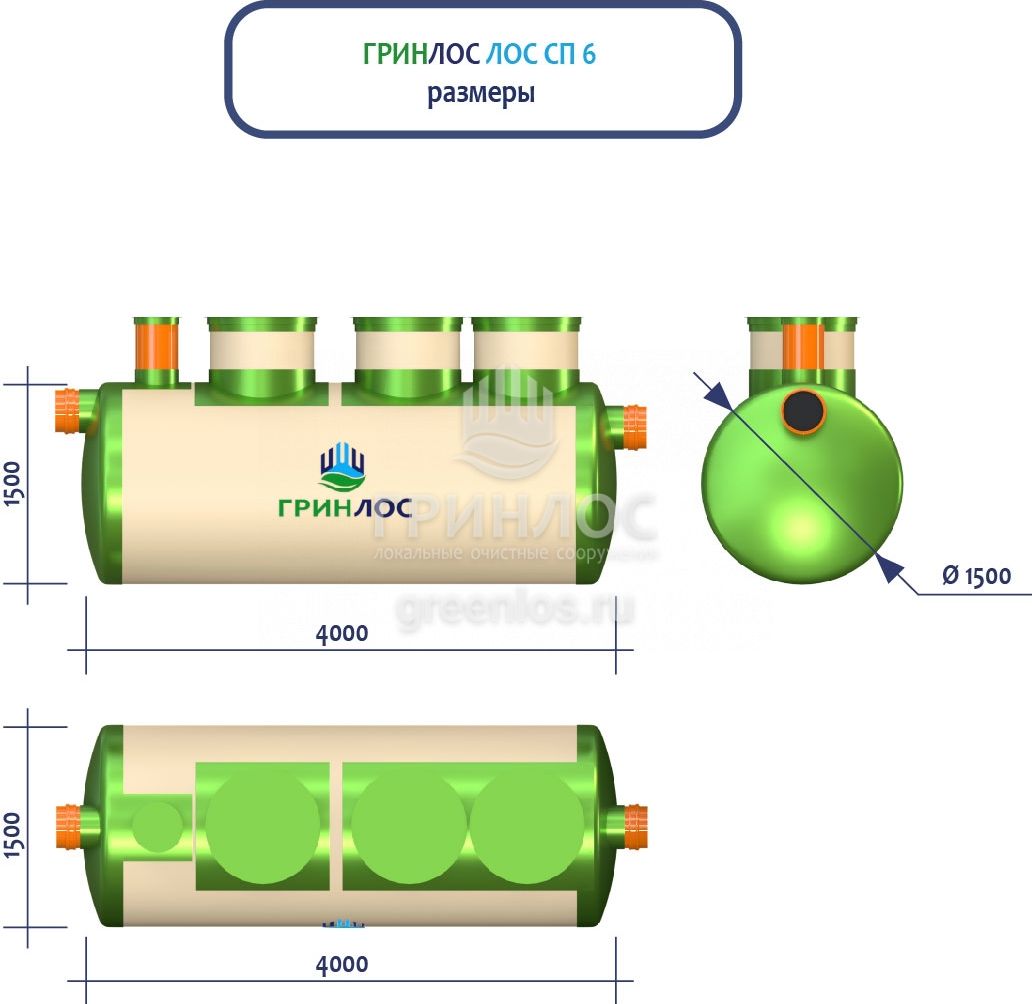 ГРИНЛОС Ливневая канализация 6-1500 стеклопластиковая представляет собой очистное сооружение ливневых стоков габаритами 4000*1500*1500 - 1 корпус. Общий объем корпусов составляет 7.1 м3. Для установки станции потребуется применение вспомогательного оборудования.