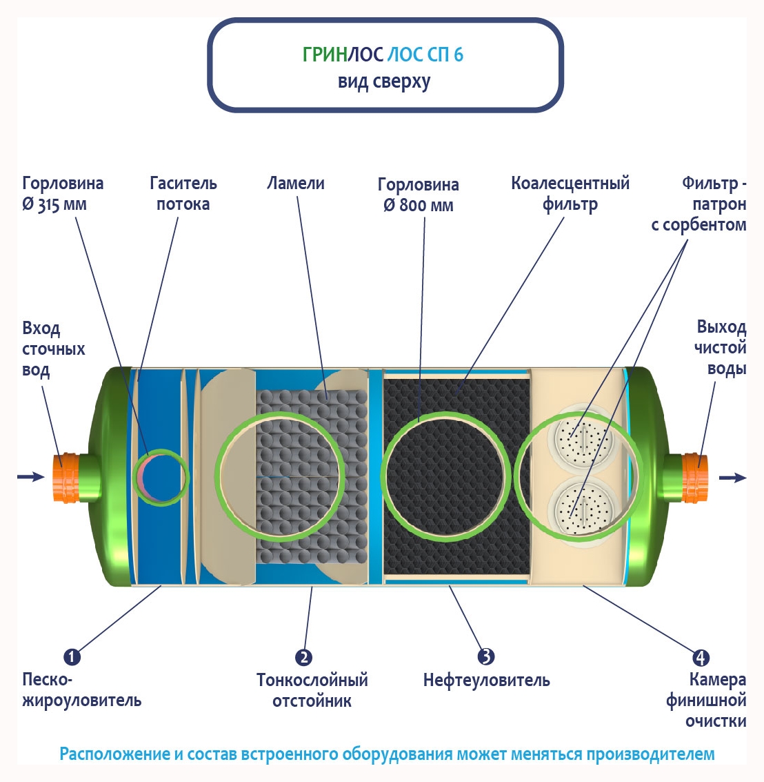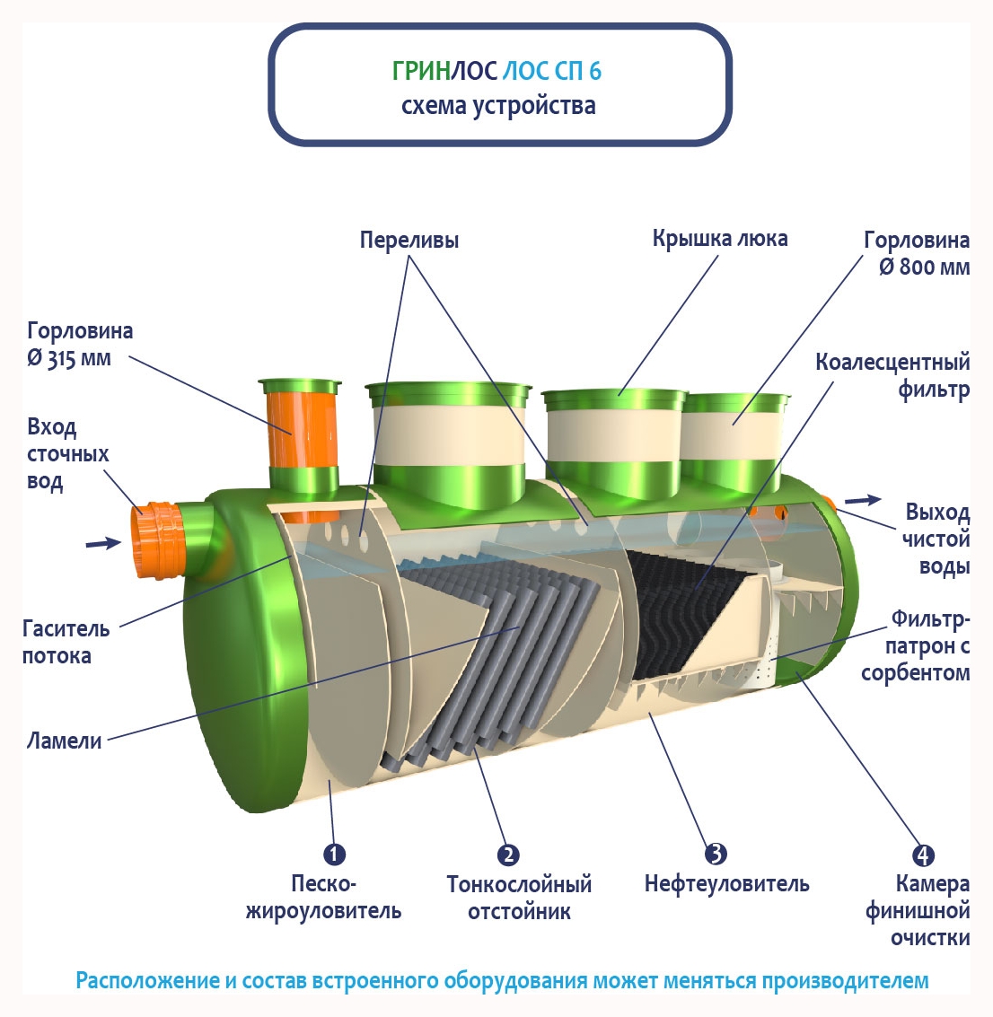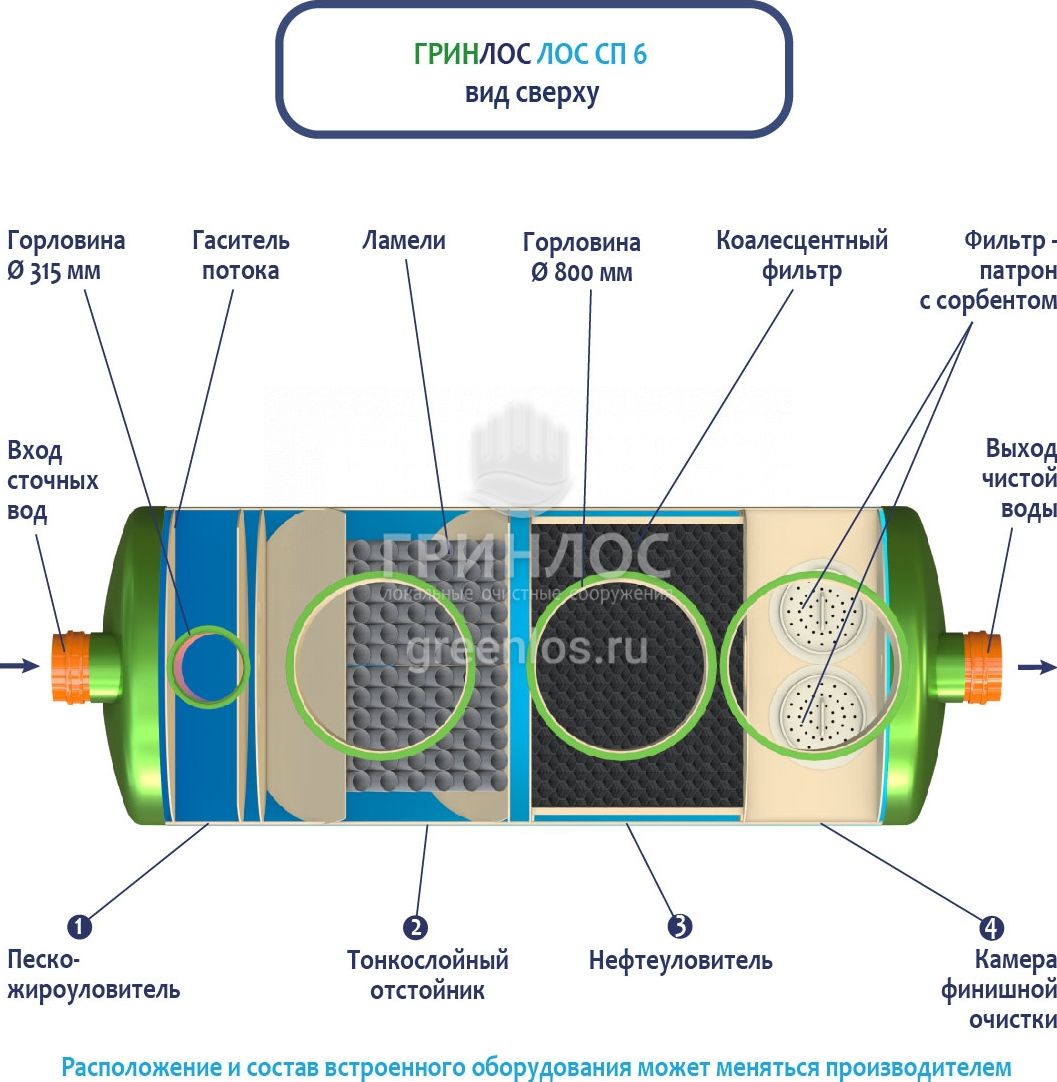 В базовую комплектацию Ливневой канализации Гринлос входит нефтеловушка, которая работает по принципу отстаивания стоков