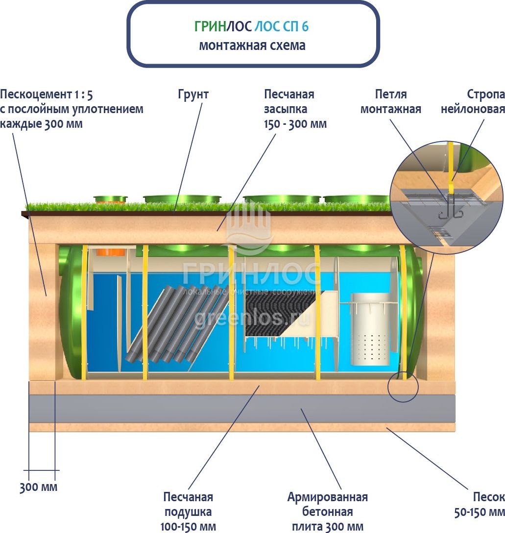 Перед началом работ выполняется входной контроль качества, осмотр оборудования с целью обнаружения дефектов, полученных при транспортировке и хранении, с последующим подписанием акта передачи оборудования в монтаж. Установка стеклопластиковой ливневой канализации ГРИНЛОС Ливневая канализация 6-1500 стеклопластиковая производится монтажным краном, с помощью четырехветвевой стропы. Изделие монтируется строго по уровню. После установки он фиксируется на плите синтетическими стропами за заранее подготовленные монтажные петли в плите.