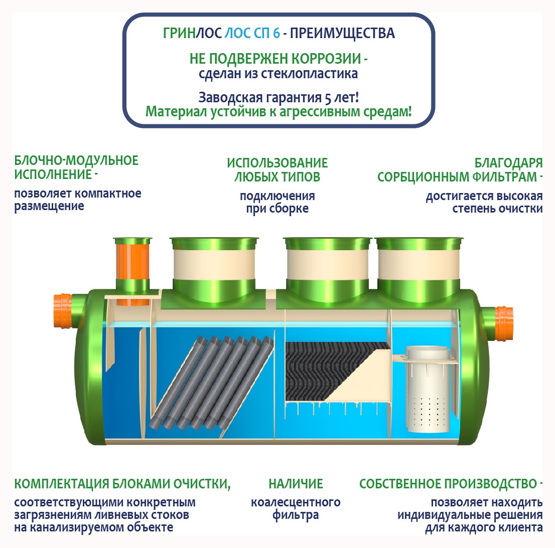 Гринлос ЛК 6-1500 Сп выполнена из стеклопластика – инертного материала, устойчивого к агрессивным средам.