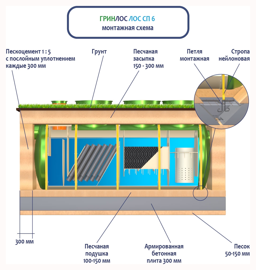 При заглублении ЛОС из стеклопластика на глубину не более 250 мм от верхнего пластикового горизонтального перекрытия до запланированного уровня земли, в однородных грунтах с низким уровнем вод обратную обсыпку допустимо производить песком, смешанным с цементом (марка не ниже М500). Соотношение цемента и песка для обсыпки составляет 1:5. Песчано-цементная засыпка производится послойно, с обязательным трамбованием и проливкой водой каждого слоя. Толщина каждого слоя 300 мм. При условии уровня грунтовых вод выше 1500 мм от уровня земли, при наличии плывуна, скальных грунтов и прочих нестандартных ситуациях, а также в случае заглубления ЛК 6-1500 Сп более чем на 250 мм песчано-цементную смесь необходимо заменить бетоном. Одновременно с засыпкой ливневой канализации, она заполняется водой. Уровень воды должен превышать уровень засыпки (бетонирования) не менее, чем на 200 мм и не более, чем на 500 мм.
