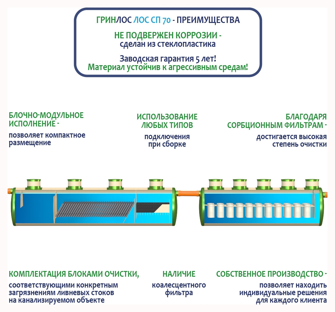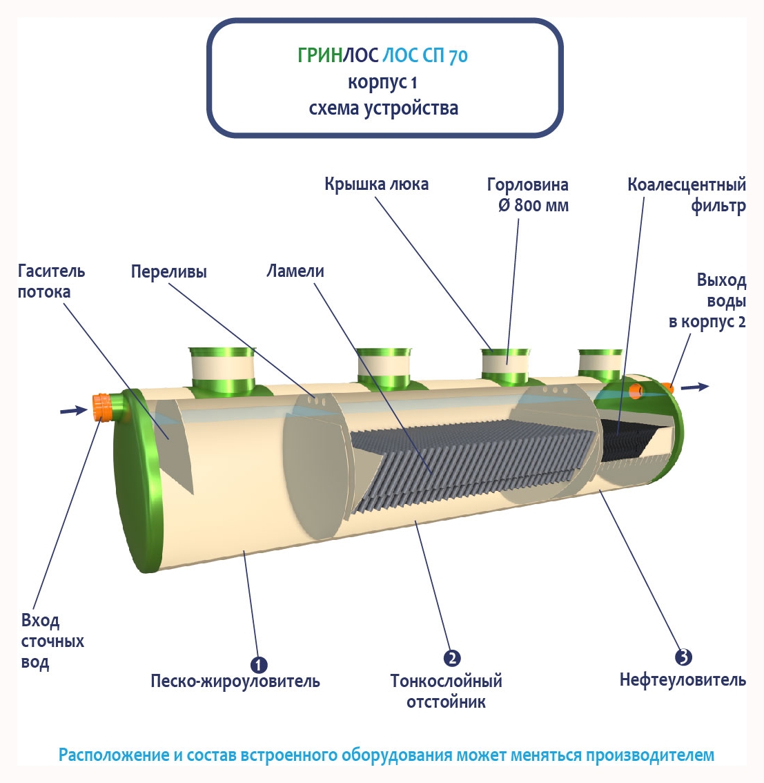 В базовую комплектацию Ливневой канализации Гринлос входит нефтеловушка, которая работает по принципу отстаивания стоков