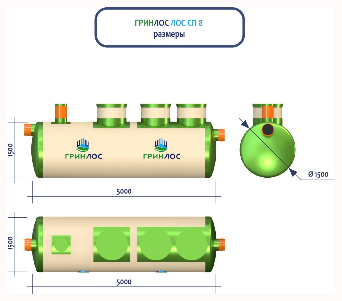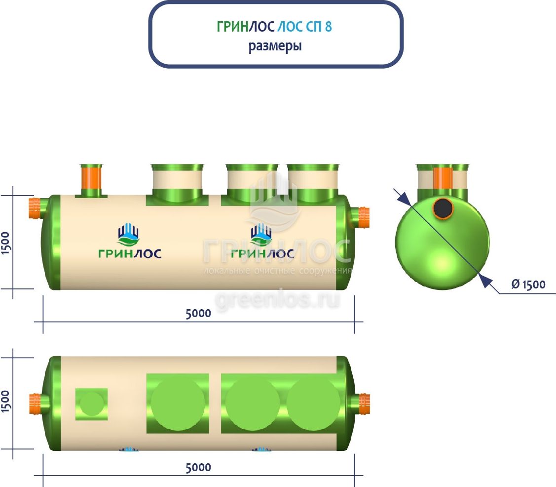 ГРИНЛОС Ливневая канализация 8-1500 стеклопластиковая представляет собой очистное сооружение ливневых стоков габаритами 5000*1500*1500 мм - 1 корпус. Общий объем корпусов составляет 8.8 м3. Для установки станции потребуется применение вспомогательного оборудования.
