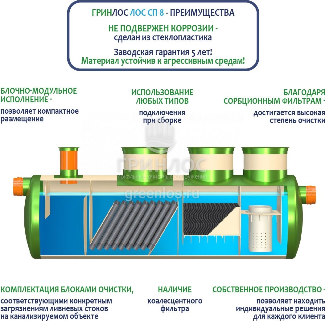 Гринлос ЛК 8-1500 Сп выполнена из стеклопластика – инертного материала, устойчивого к агрессивным средам.