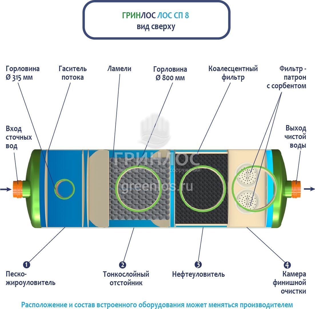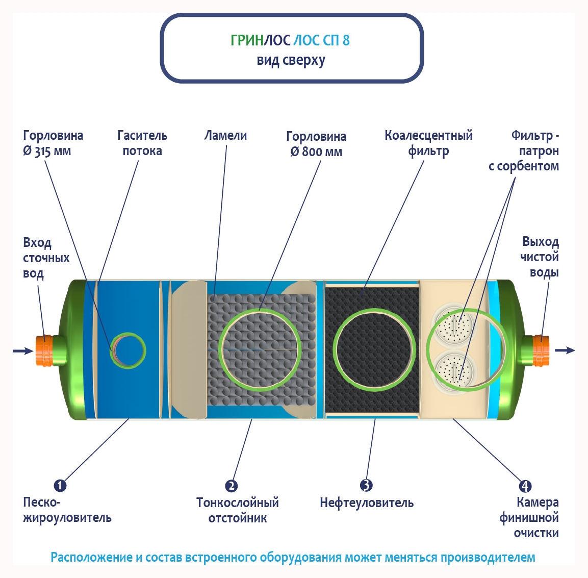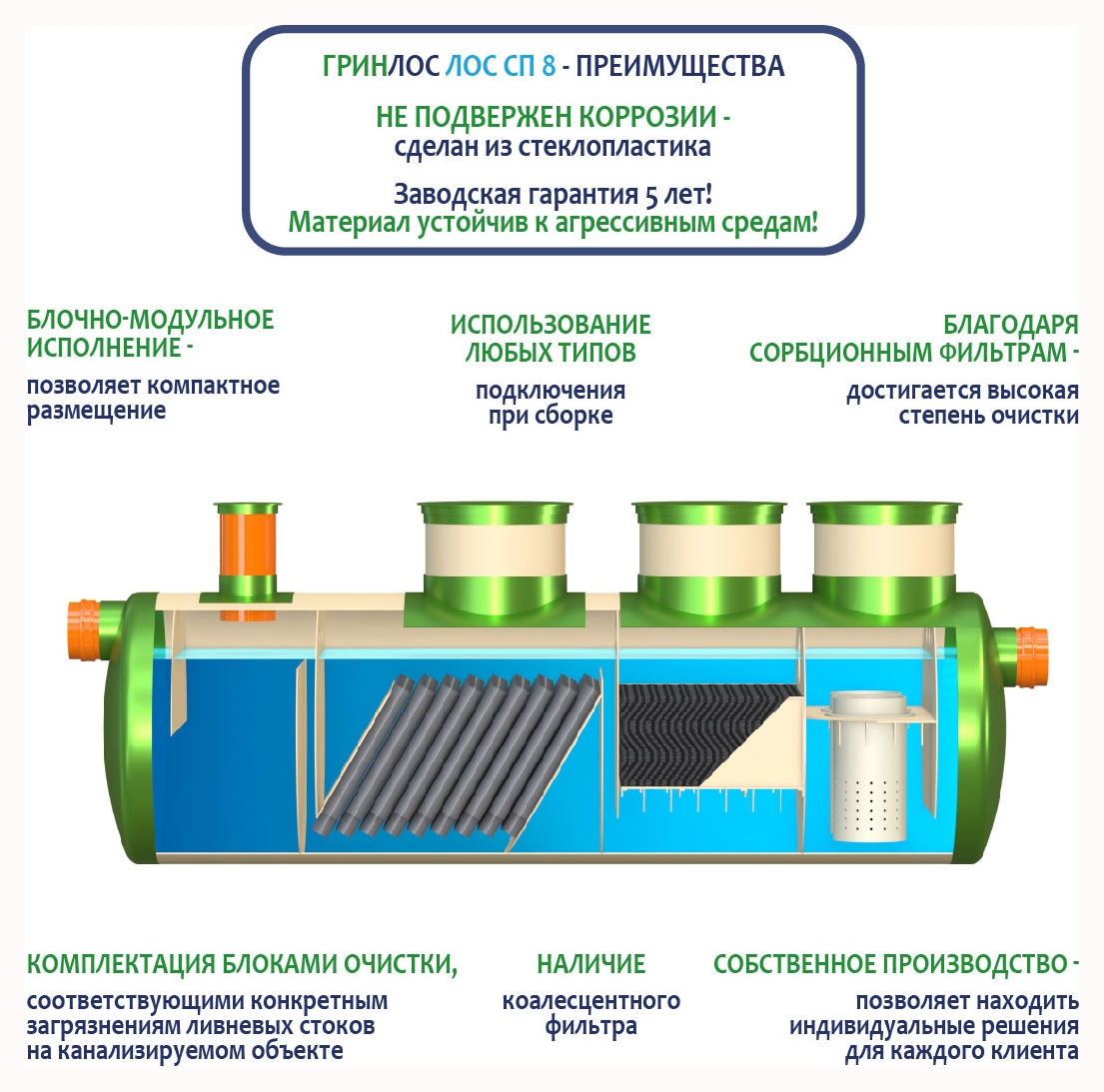 В базовую комплектацию Ливневой канализации Гринлос входит нефтеловушка, которая работает по принципу отстаивания стоков