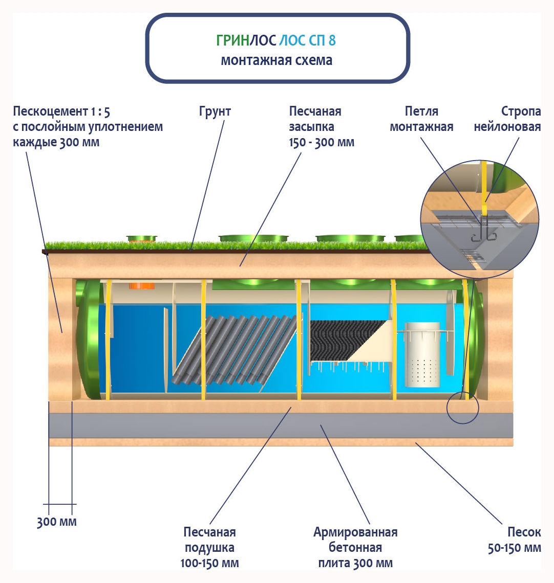 При заглублении ЛОС из стеклопластика на глубину не более 250 мм от верхнего пластикового горизонтального перекрытия до запланированного уровня земли, в однородных грунтах с низким уровнем вод обратную обсыпку допустимо производить песком, смешанным с цементом (марка не ниже М500). Соотношение цемента и песка для обсыпки составляет 1:5. Песчано-цементная засыпка производится послойно, с обязательным трамбованием и проливкой водой каждого слоя. Толщина каждого слоя 300 мм. При условии уровня грунтовых вод выше 1500 мм от уровня земли, при наличии плывуна, скальных грунтов и прочих нестандартных ситуациях, а также в случае заглубления ЛК 8-1500 Сп более чем на 250 мм песчано-цементную смесь необходимо заменить бетоном. Одновременно с засыпкой ливневой канализации, она заполняется водой. Уровень воды должен превышать уровень засыпки (бетонирования) не менее, чем на 200 мм и не более, чем на 500 мм.