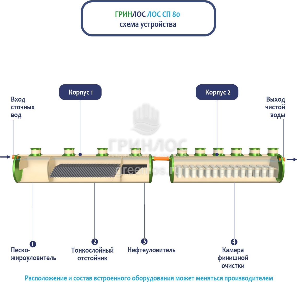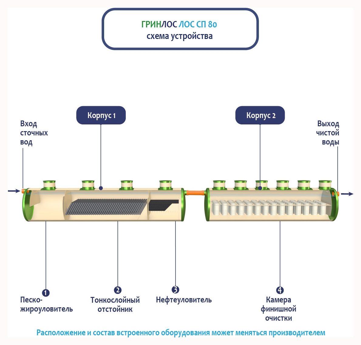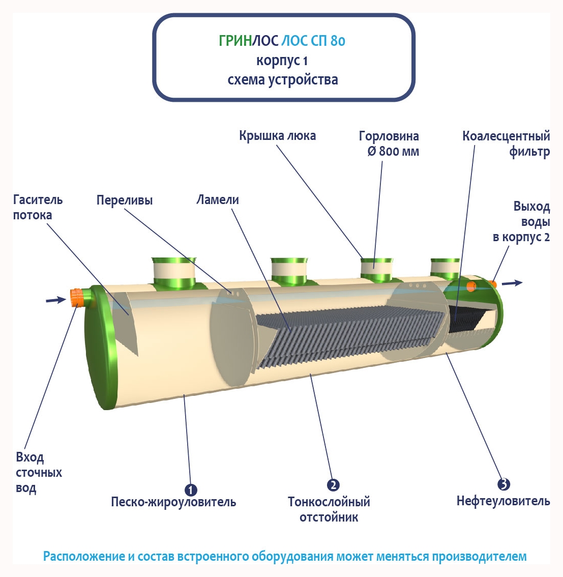 В базовую комплектацию Ливневой канализации Гринлос входит нефтеловушка, которая работает по принципу отстаивания стоков