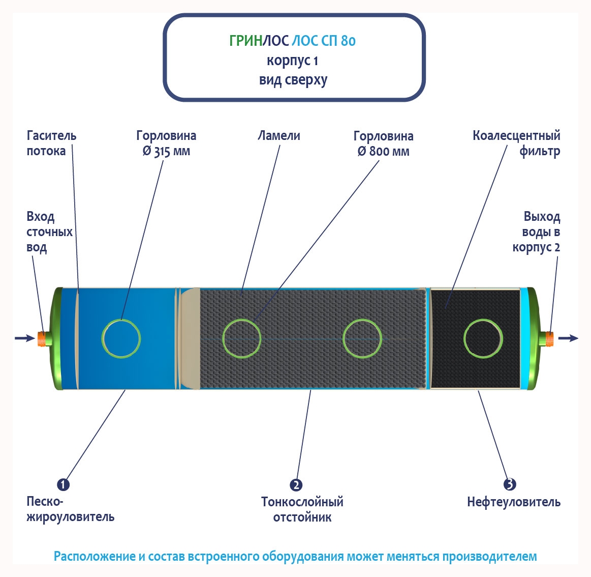 Стоки через входной патрубок корпуса Гринлос ГРИНЛОС Ливневая канализация 80-2300 стеклопластиковая попадают в песко-жироуловитель, где под воздействием седиментации из стоков выделяются взвеси и маслянистые вещества, за счет разницы плотностей твердые частицы оседают на дно, жиры собираются на поверхности.