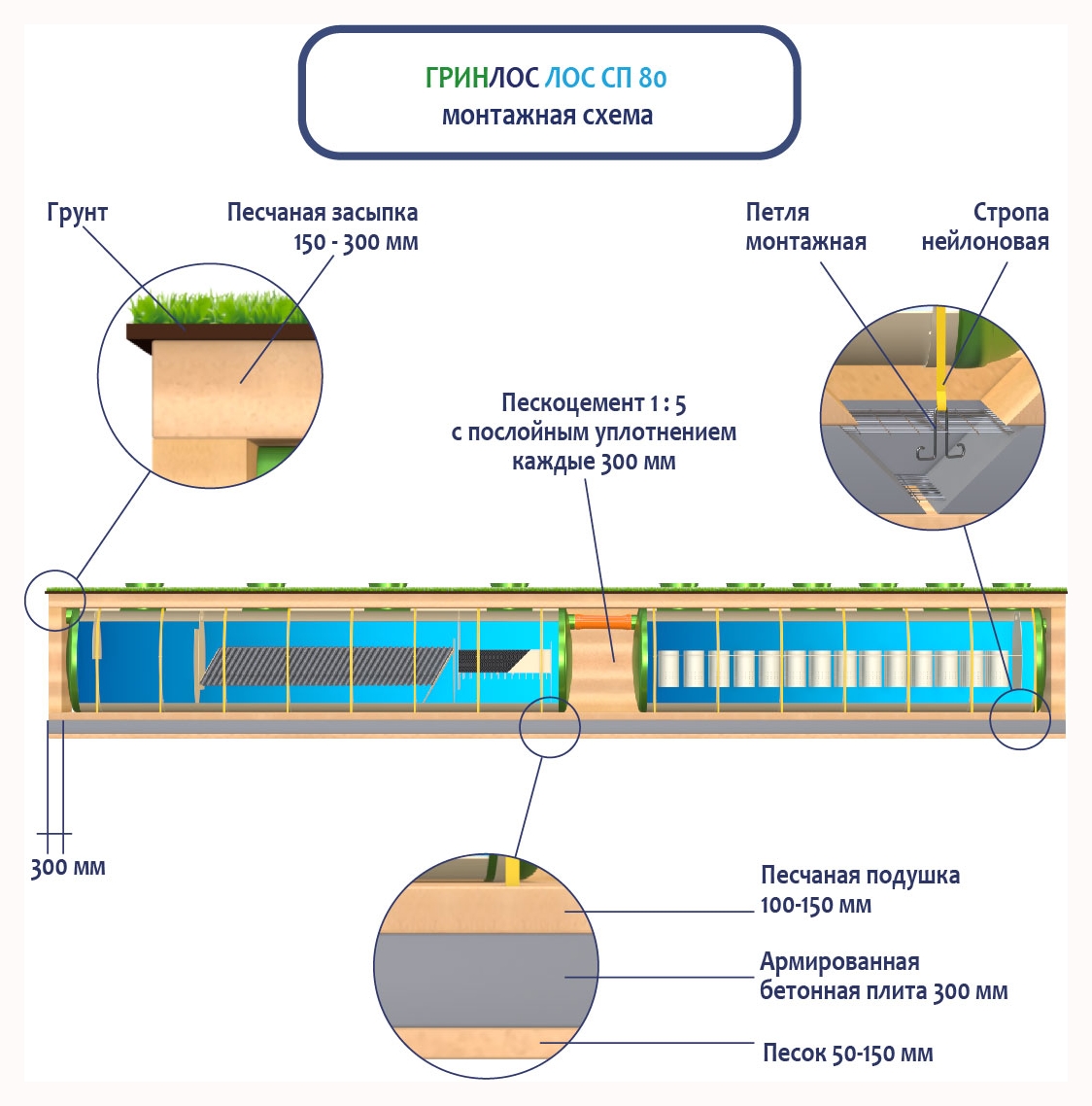 При заглублении ЛОС из стеклопластика на глубину не более 250 мм от верхнего пластикового горизонтального перекрытия до запланированного уровня земли, в однородных грунтах с низким уровнем вод обратную обсыпку допустимо производить песком, смешанным с цементом (марка не ниже М500). Соотношение цемента и песка для обсыпки составляет 1:5. Песчано-цементная засыпка производится послойно, с обязательным трамбованием и проливкой водой каждого слоя. Толщина каждого слоя 300 мм. При условии уровня грунтовых вод выше 1500 мм от уровня земли, при наличии плывуна, скальных грунтов и прочих нестандартных ситуациях, а также в случае заглубления ЛК 80-2300 Сп более чем на 250 мм песчано-цементную смесь необходимо заменить бетоном. Одновременно с засыпкой ливневой канализации, она заполняется водой. Уровень воды должен превышать уровень засыпки (бетонирования) не менее, чем на 200 мм и не более, чем на 500 мм.