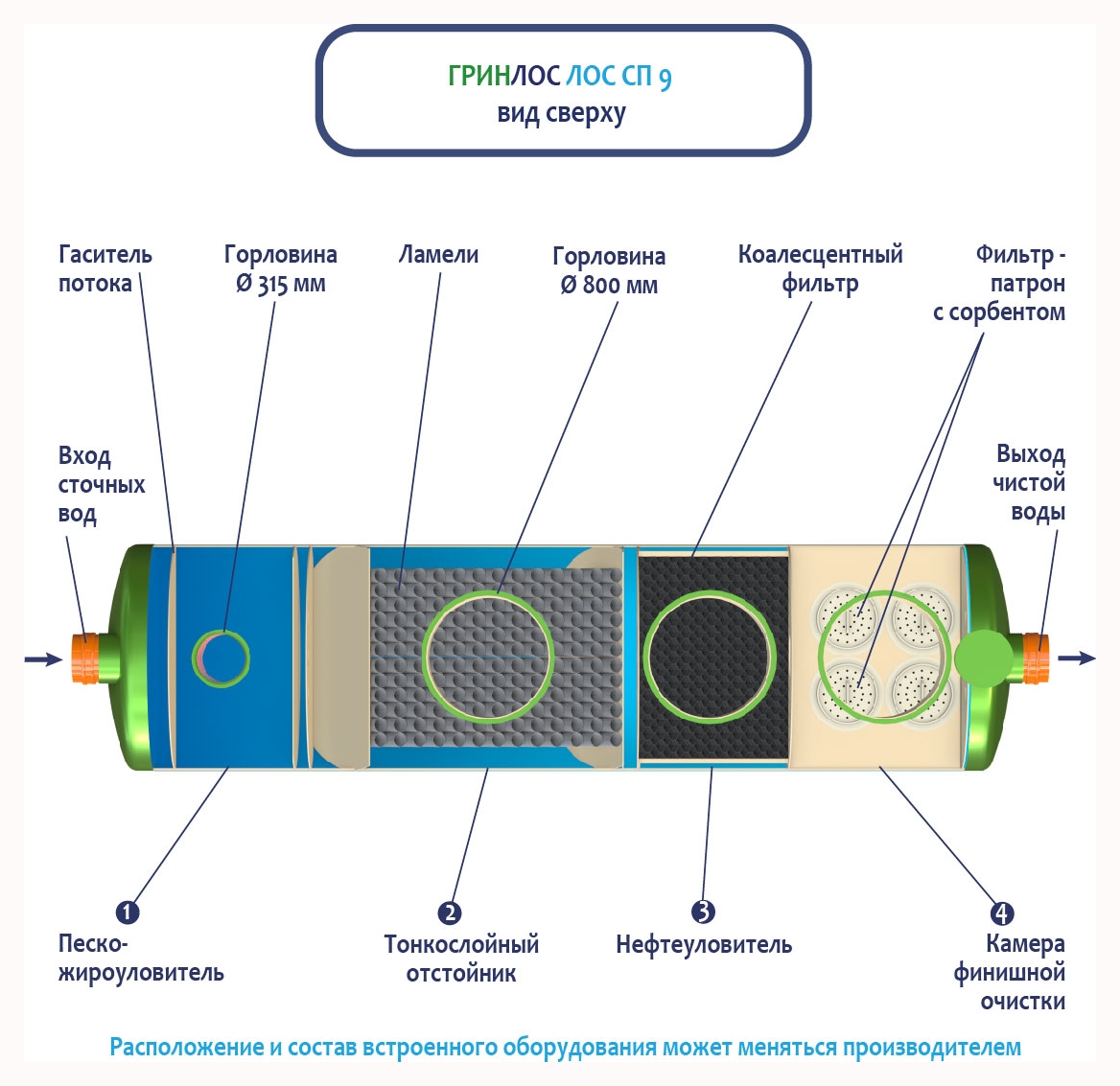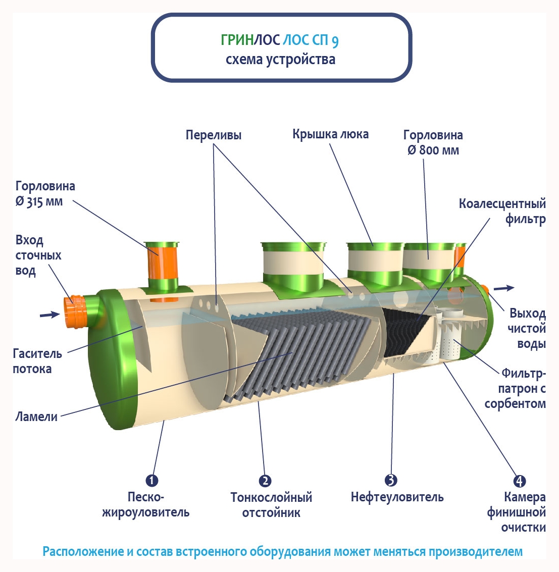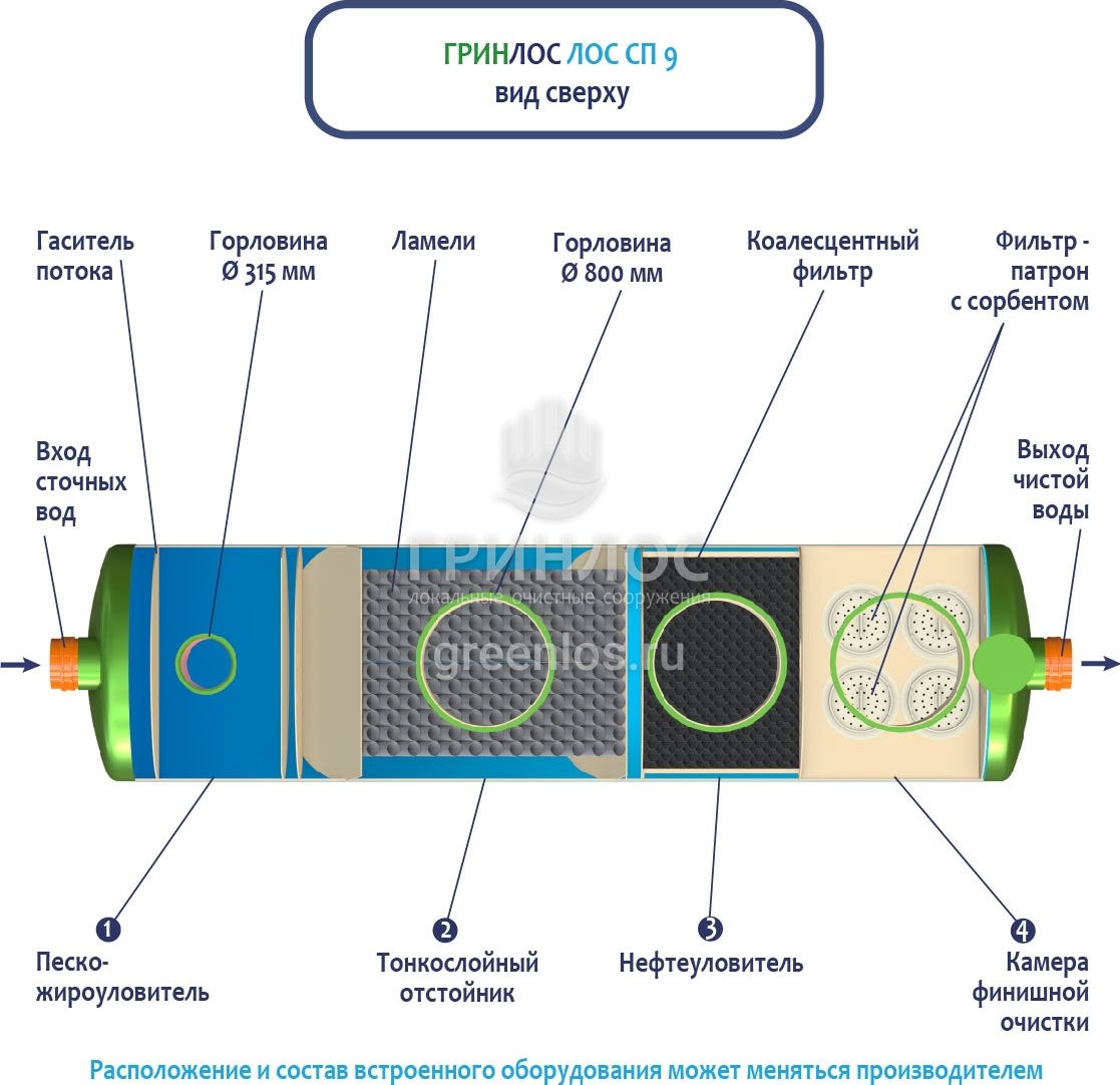 В базовую комплектацию Ливневой канализации Гринлос входит нефтеловушка, которая работает по принципу отстаивания стоков
