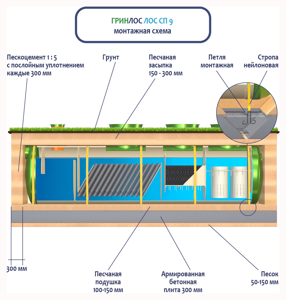 При заглублении ЛОС из стеклопластика на глубину не более 250 мм от верхнего пластикового горизонтального перекрытия до запланированного уровня земли, в однородных грунтах с низким уровнем вод обратную обсыпку допустимо производить песком, смешанным с цементом (марка не ниже М500). Соотношение цемента и песка для обсыпки составляет 1:5. Песчано-цементная засыпка производится послойно, с обязательным трамбованием и проливкой водой каждого слоя. Толщина каждого слоя 300 мм. При условии уровня грунтовых вод выше 1500 мм от уровня земли, при наличии плывуна, скальных грунтов и прочих нестандартных ситуациях, а также в случае заглубления ЛК 9-1500 Сп более чем на 250 мм песчано-цементную смесь необходимо заменить бетоном. Одновременно с засыпкой ливневой канализации, она заполняется водой. Уровень воды должен превышать уровень засыпки (бетонирования) не менее, чем на 200 мм и не более, чем на 500 мм.