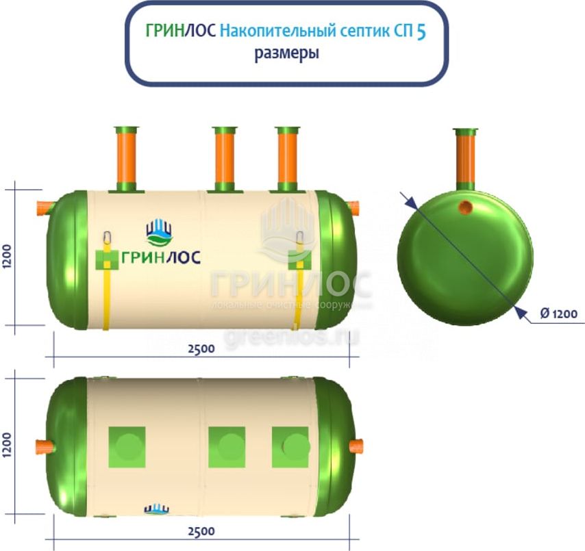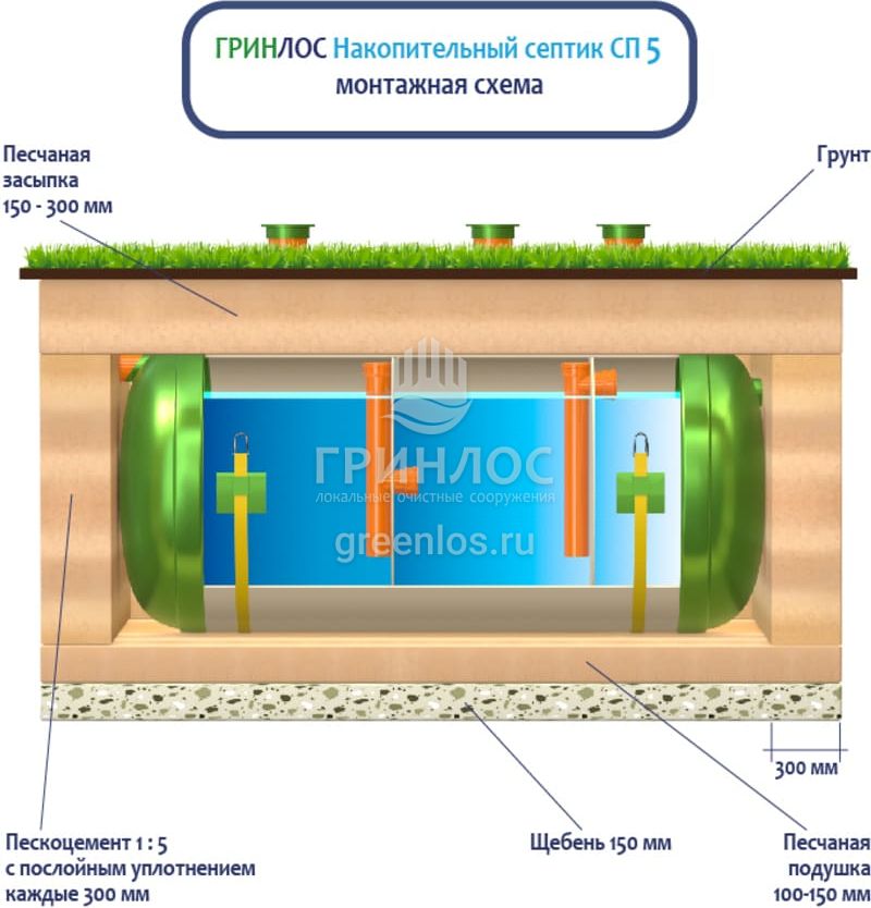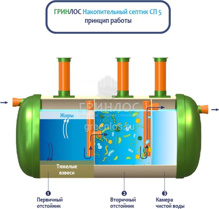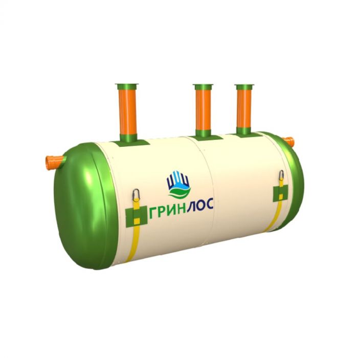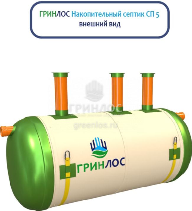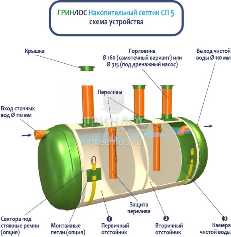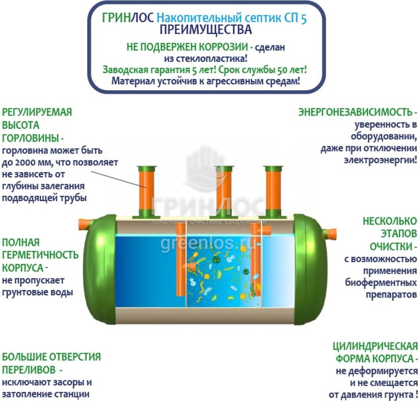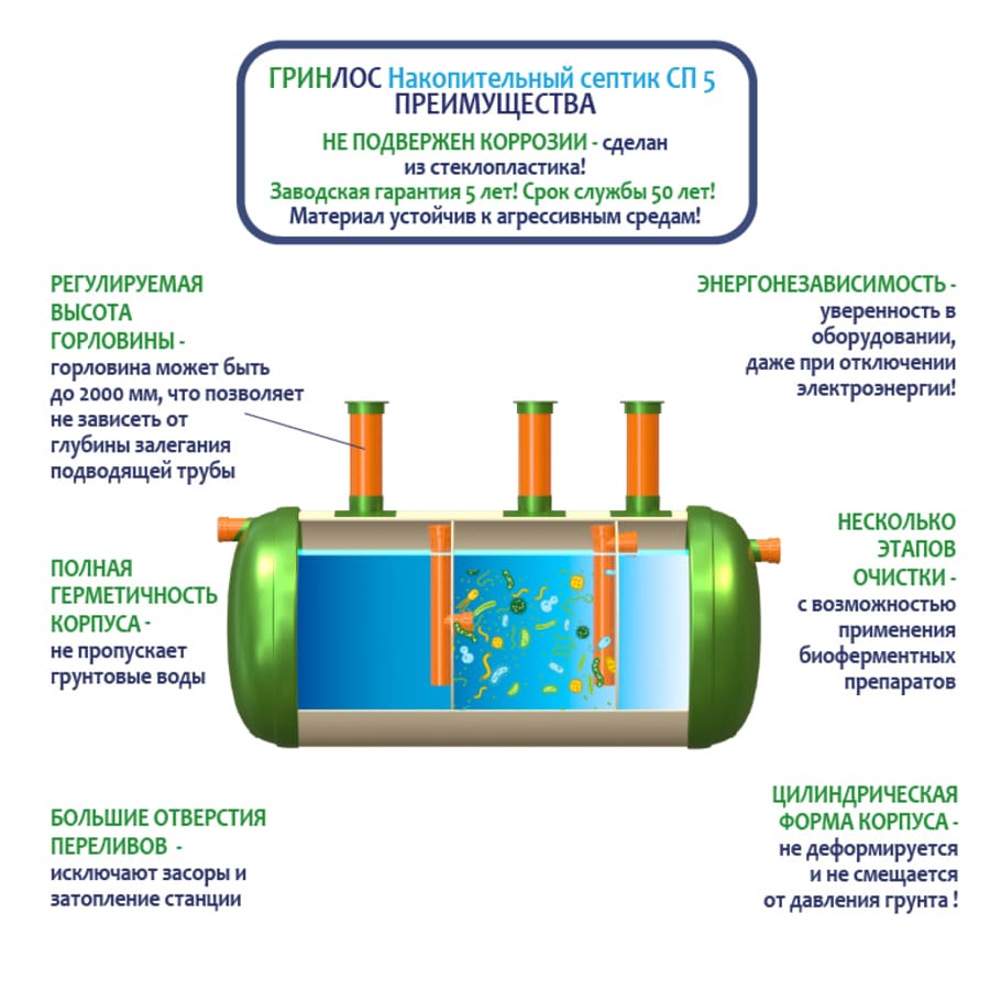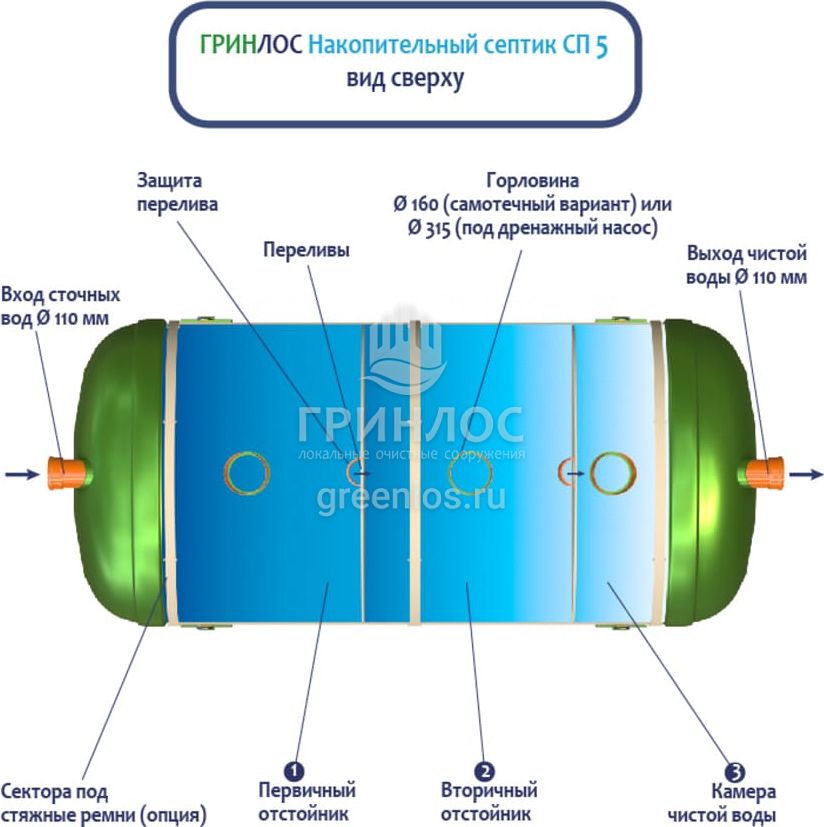 Конструкция Накопительный Гринлос СП 5 представляет собой цилиндр, выполненный из стеклопластика. Внутри цилиндр с помощью перегородок разделен на камеры, сообщающиеся между собой через отверстия для перелива.