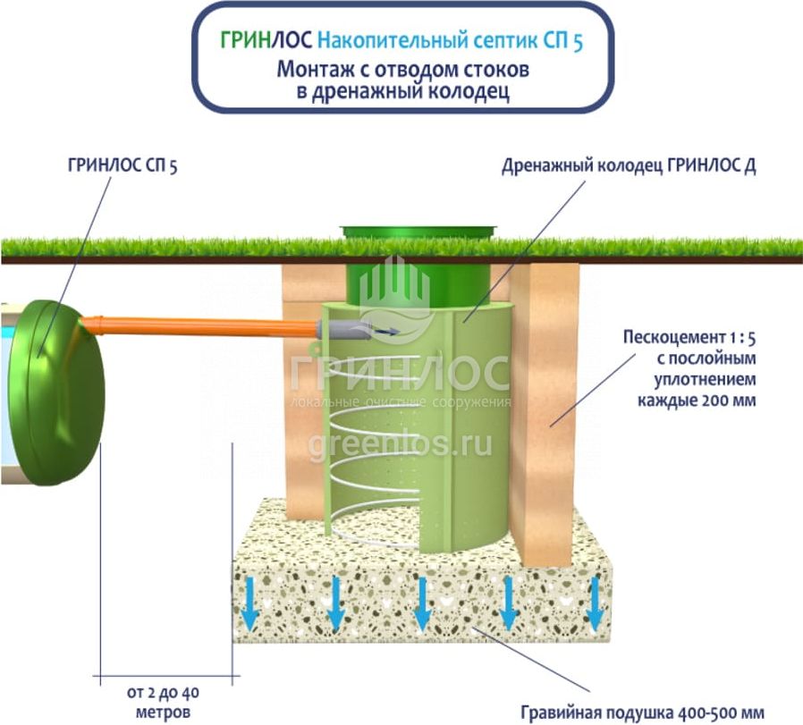 Монтаж с отводом очищенных сточных вод в дренажный колодец. Подходит для хорошо поглощающих грунтов (песок, супесь) и низком уровне грунтовых вод. Колодец поглощения может быть выполнен из бетонных колец или при помощи пластикового колодца с перфорированным основанием и стенками. При монтаже колодца поглощения на выпуск трубы рекомендуется смонтировать обратный клапан для защиты Накопительного септика Гринлос СП 5 от обратного затопления в периоды активного снеготаяния или в дождливое межсезонье. Непосредственно под выпуском отводящей трубы от септика рекомендуется смонтировать аварийный насос для дополнительной защиты Накопительный Гринлос СП 5 от обратного затопления из колодца поглощения.
