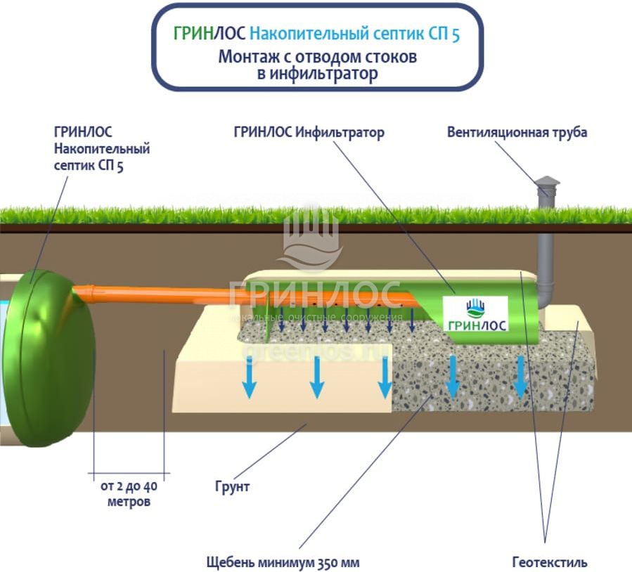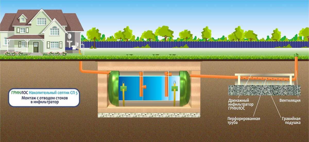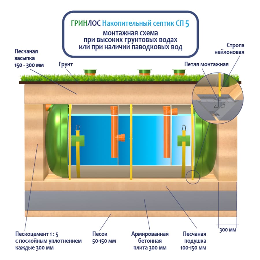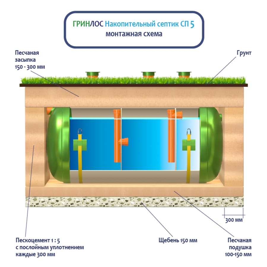 Накопительный септик ГРИНЛОС СП 5 — это энергонезависимый септик с залповым сбросом 240 л и производительностью 1 м3/сутки, что делает его подходящим для домов, в которых число жильцов не превышает 5 условных пользователей.