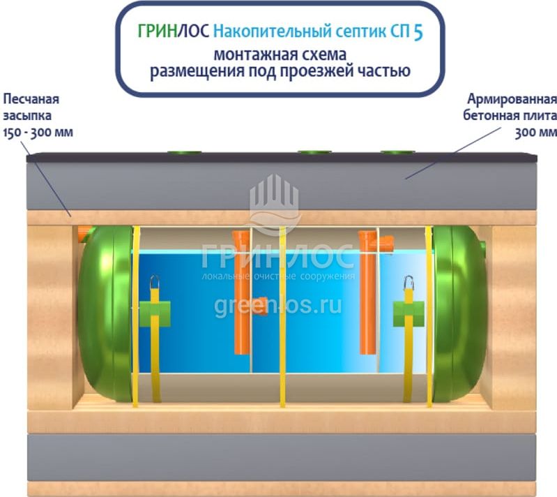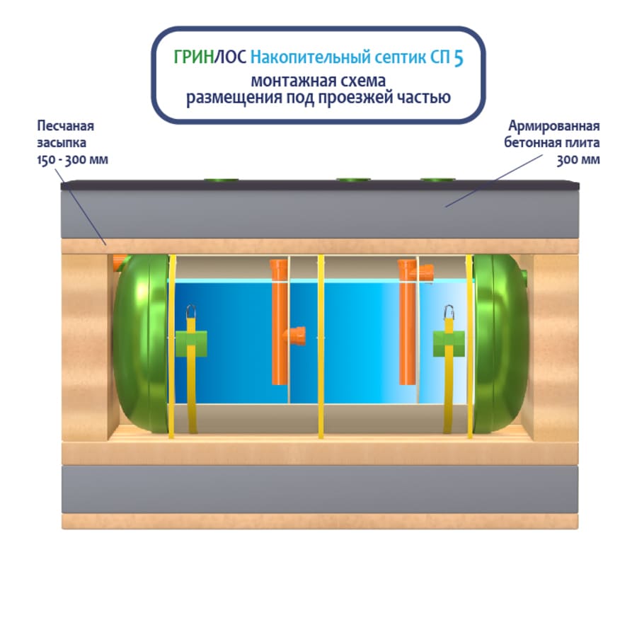 Накопительный Гринлос СП 5 - энергонезависимый септик накопительного типа, поэтому его следует располагать на участке так, чтобы к нему мог беспрепятственно подъехать ассенизационный автомобиль. Над местом установки Накопительного септика СП 5 не допускается движение и стоянка автотранспорта в радиусе 2,5 м. В случае необходимости проезда автотранспорта или организации стоянки, над очистным сооружением и над подводящей и отводящей трассами следует оборудовать разгрузочную плиту.