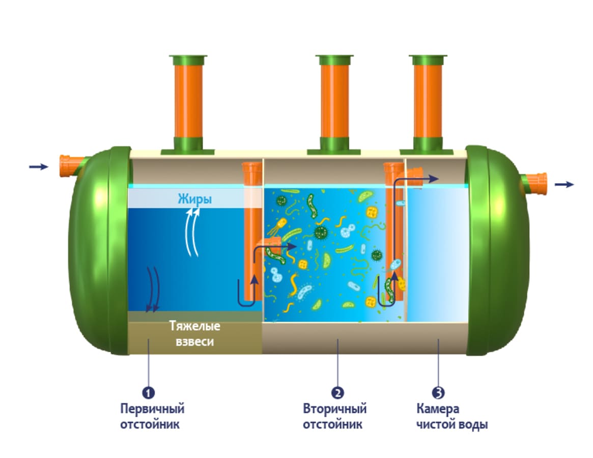 По канализационной трубе от дома сточные воды поступают в первый бак или отсек (первичный отстойник).