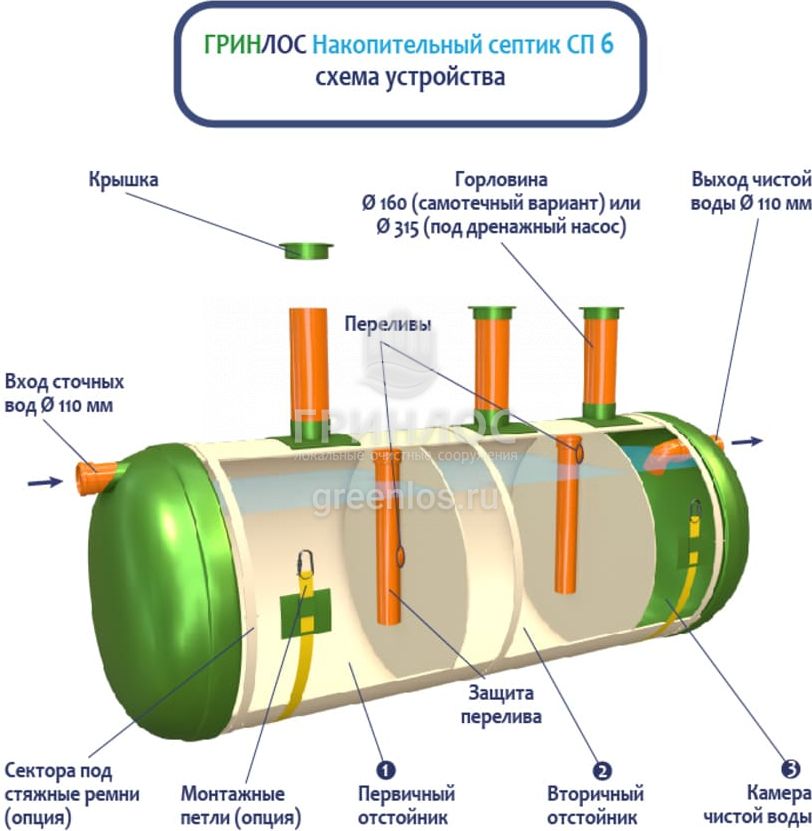 Конструкция Накопительный Гринлос СП 6 представляет собой цилиндр, выполненный из стеклопластика. Внутри цилиндр с помощью перегородок разделен на камеры, сообщающиеся между собой через отверстия для перелива.