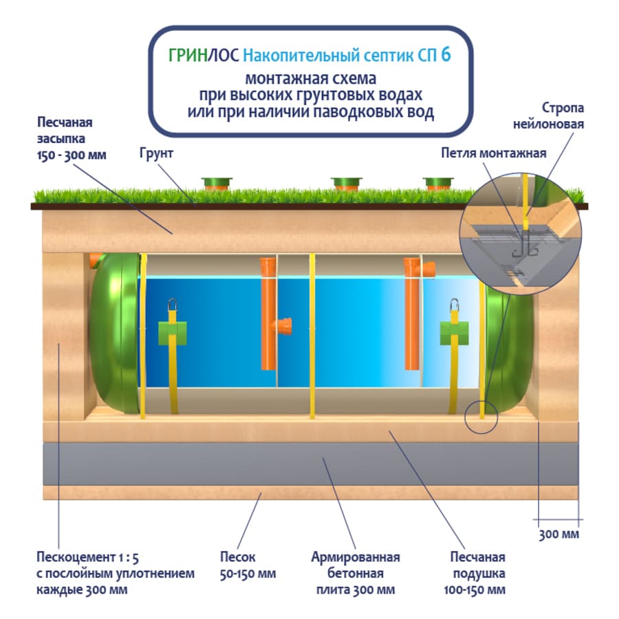 Накопительный Гринлос СП 6 - энергонезависимый септик накопительного типа, поэтому его следует располагать на участке так, чтобы к нему мог беспрепятственно подъехать ассенизационный автомобиль. Над местом установки Накопительного септика СП 6 не допускается движение и стоянка автотранспорта в радиусе 2,5 м. В случае необходимости проезда автотранспорта или организации стоянки, над очистным сооружением и над подводящей и отводящей трассами следует оборудовать разгрузочную плиту.