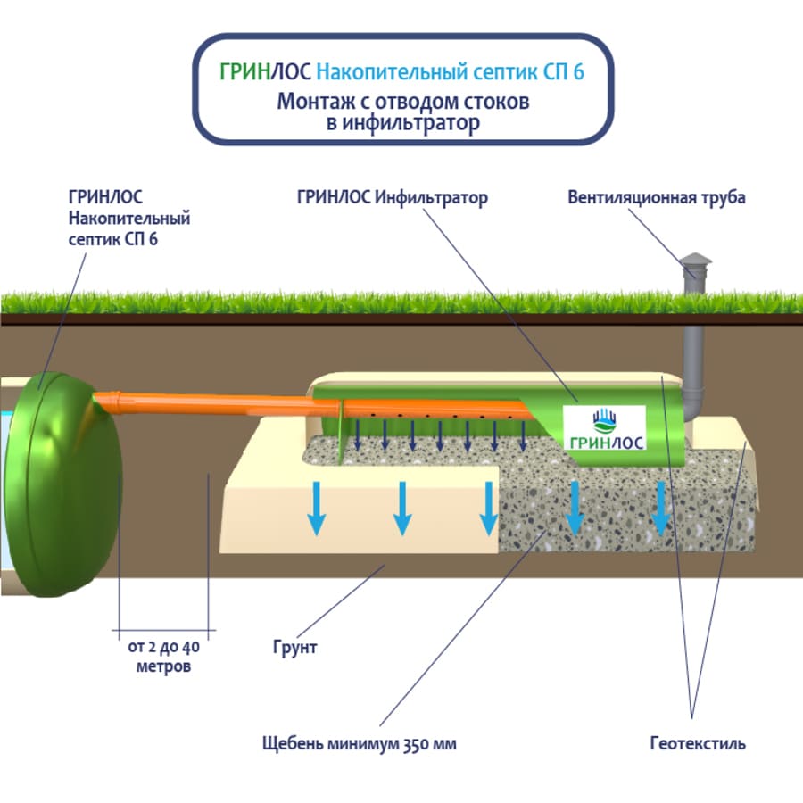 Накопительный септик ГРИНЛОС СП 6 — это энергонезависимый септик с залповым сбросом 280 л и производительностью 1.2 м3/сутки, что делает его подходящим для домов, в которых число жильцов не превышает 6 условных пользователей.