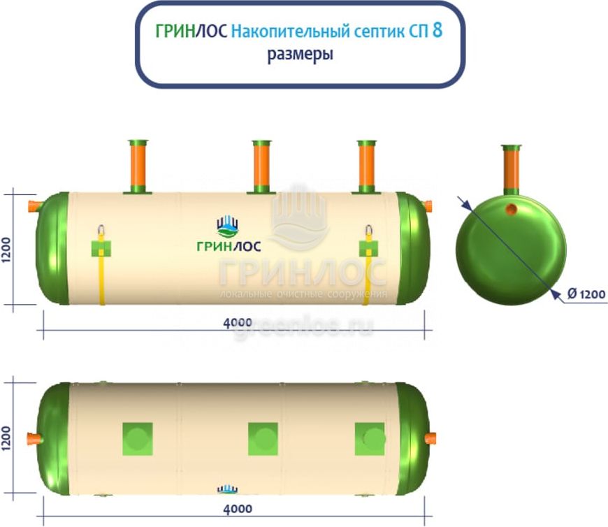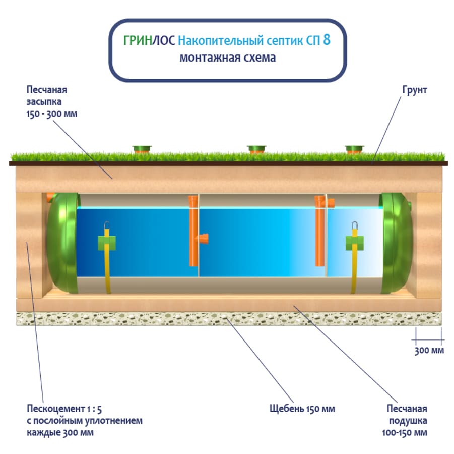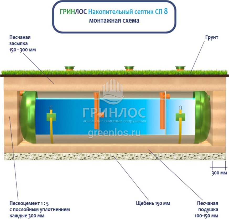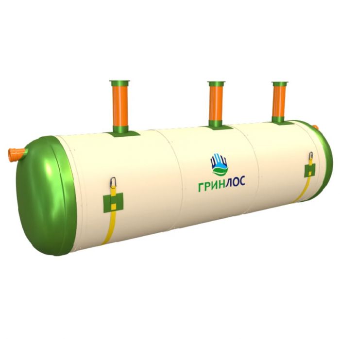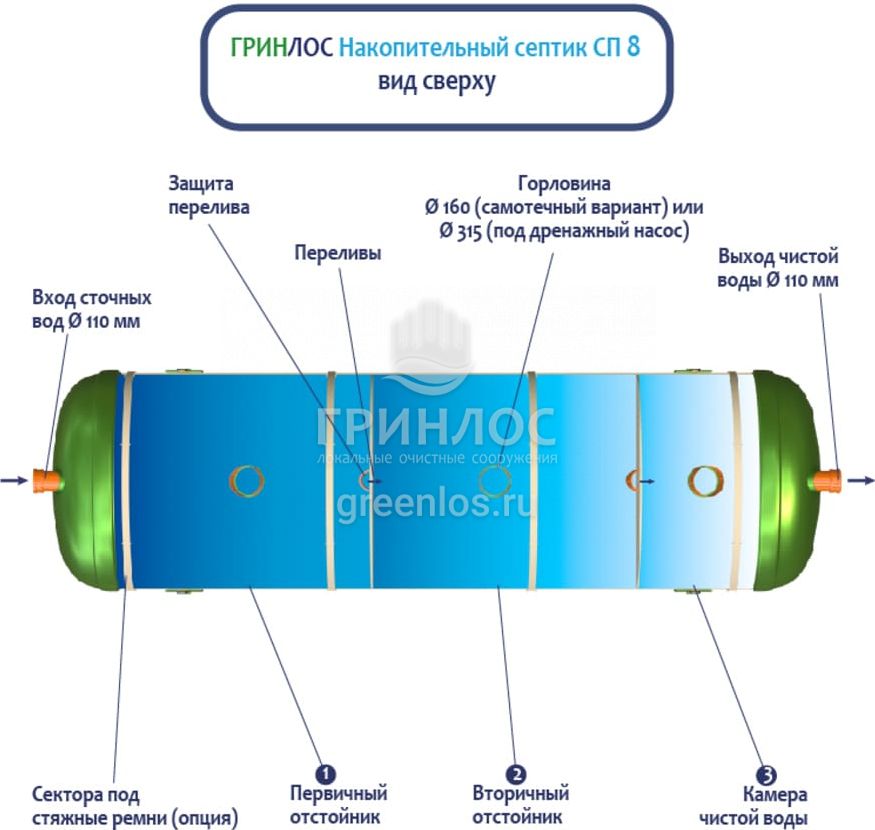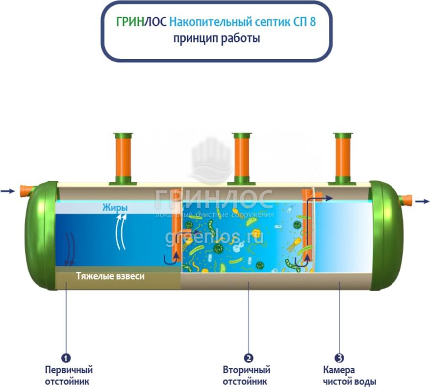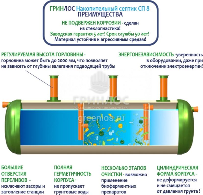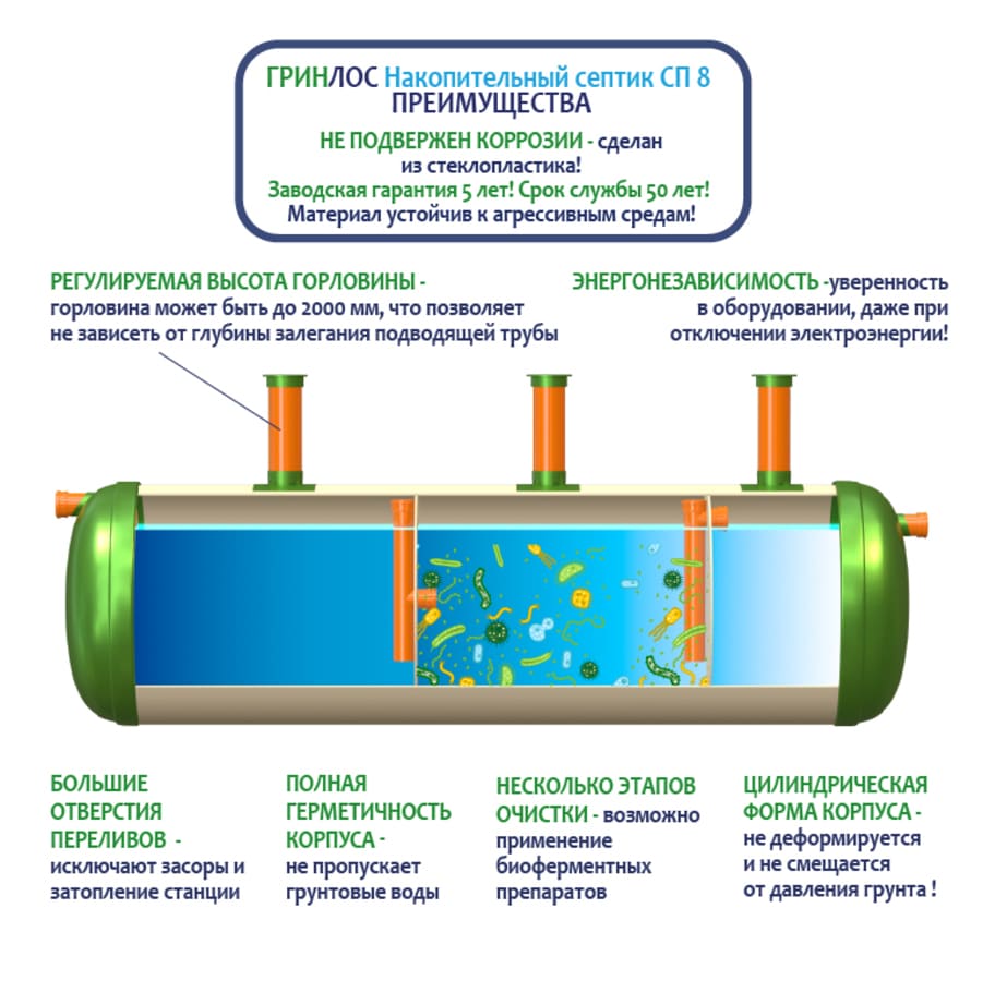 Конструкция Накопительный Гринлос СП 8 представляет собой цилиндр, выполненный из стеклопластика. Внутри цилиндр с помощью перегородок разделен на камеры, сообщающиеся между собой через отверстия для перелива.