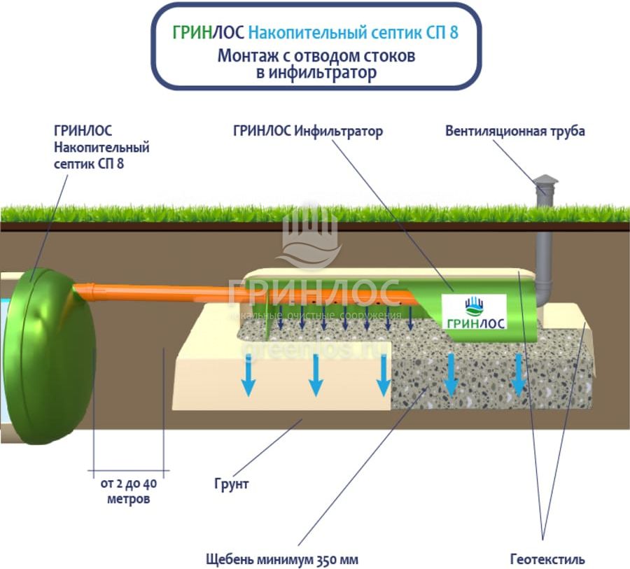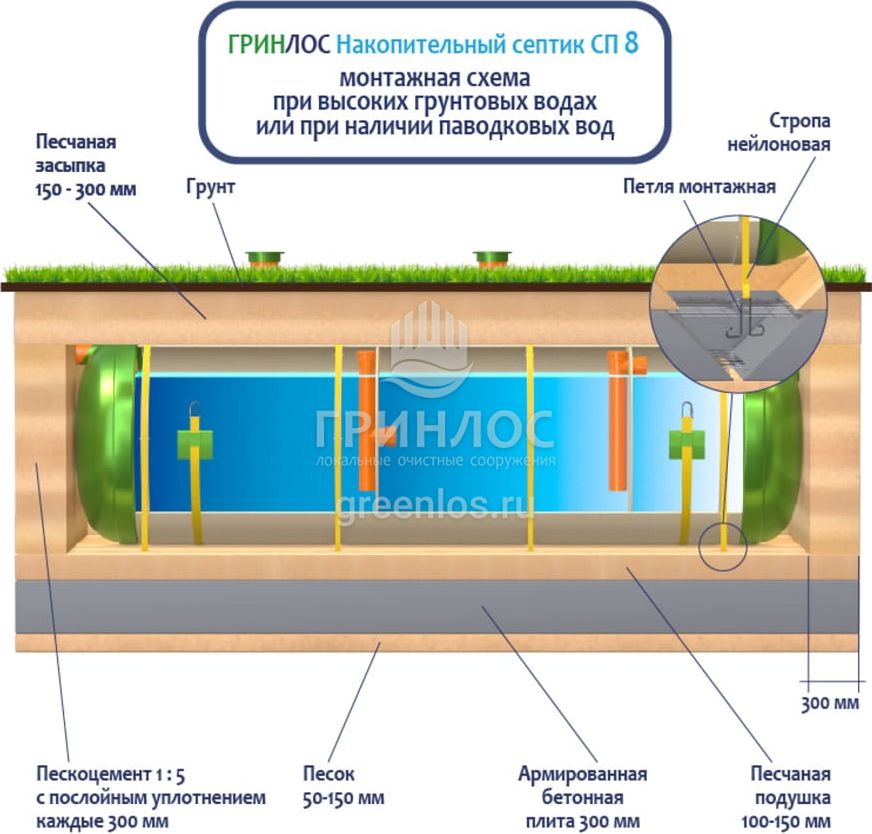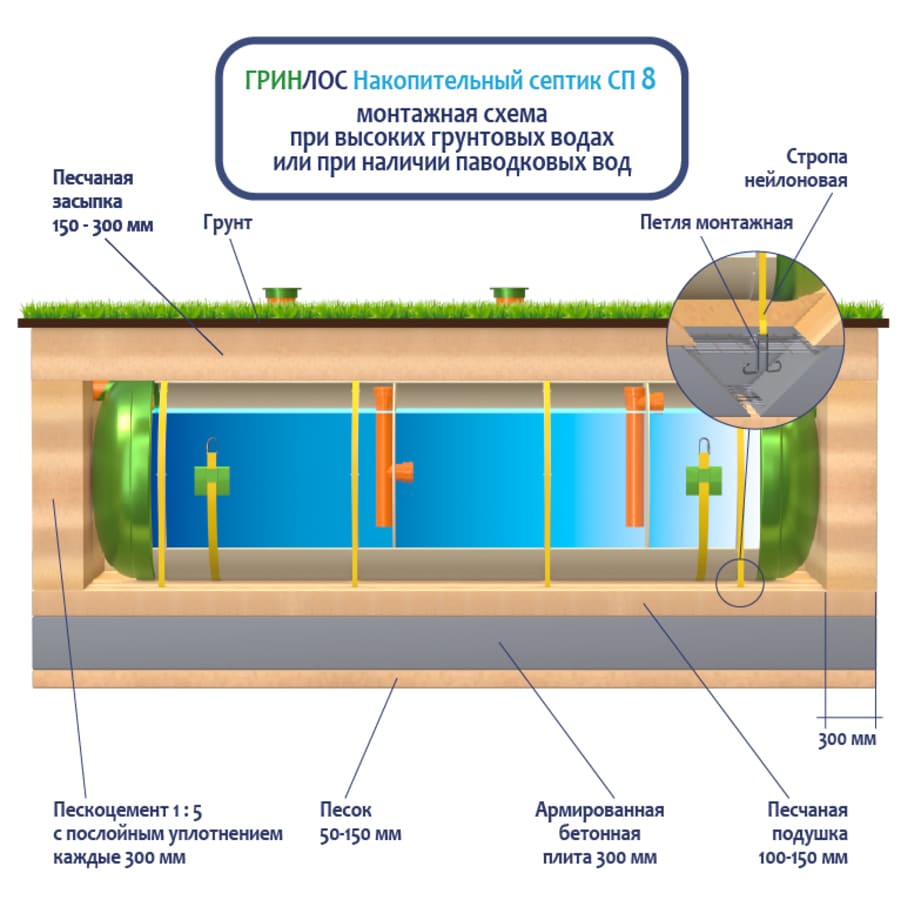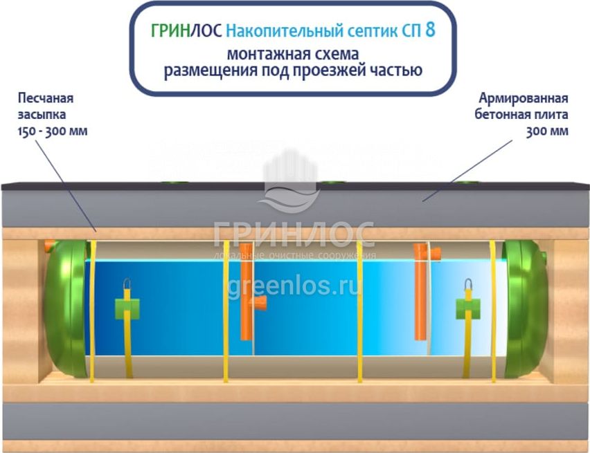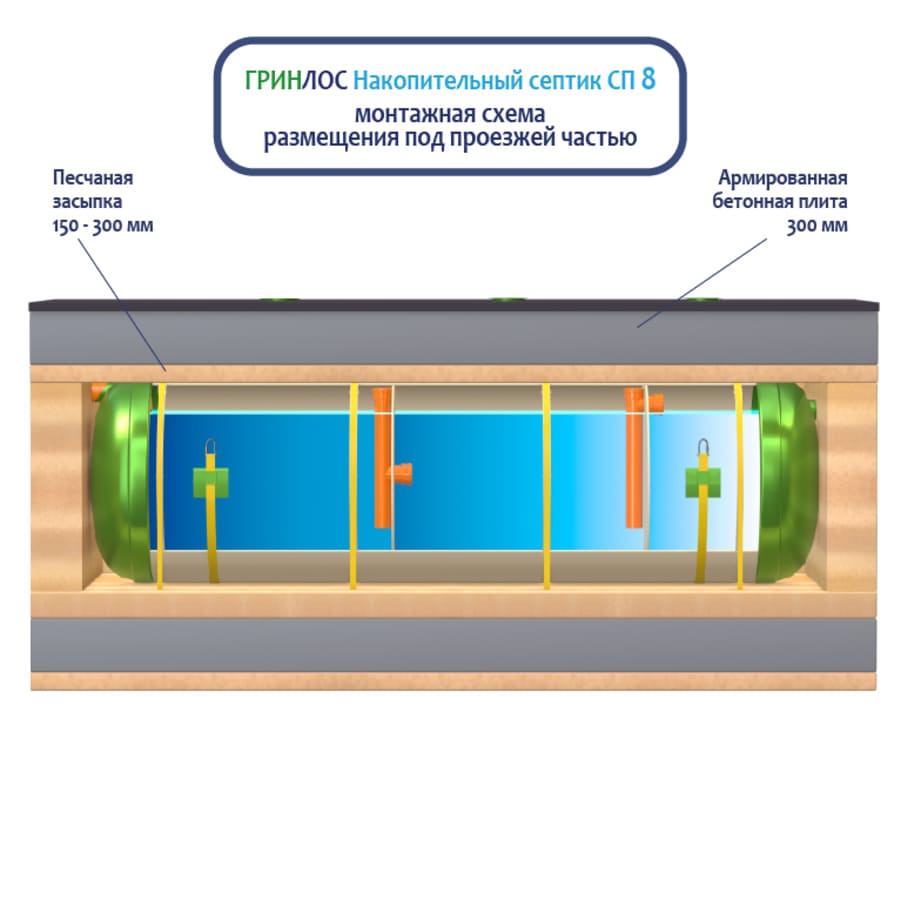 Накопительный Гринлос СП 8 - энергонезависимый септик накопительного типа, поэтому его следует располагать на участке так, чтобы к нему мог беспрепятственно подъехать ассенизационный автомобиль. Над местом установки Накопительного септика СП 8 не допускается движение и стоянка автотранспорта в радиусе 2,5 м. В случае необходимости проезда автотранспорта или организации стоянки, над очистным сооружением и над подводящей и отводящей трассами следует оборудовать разгрузочную плиту.